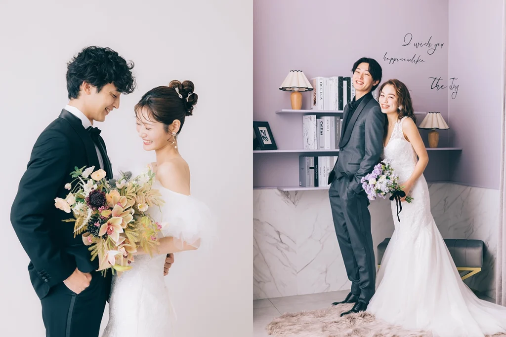 セルフウェディングフォト専門の写真館は、プロカメラマンやヘアメイクスタッフなどの人件費や衣裳代が含まれていないので、リーズナブルに撮影できることがメリット。ご自分で衣裳を手配することができるため、工夫次第でグッと予算を抑えることが可能です。