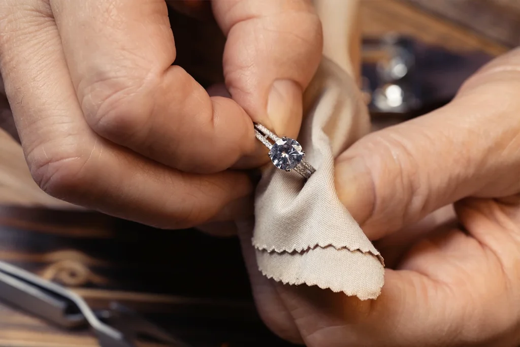 軽いくすみや汚れ程度なら、ジュエリークロスやめがね拭きのような柔らかい布で、指輪を乾拭きするだけでも皮脂汚れやほこりを取ることができます。丁寧に布で乾拭きするだけでもキレイになります。こまめなお手入れを心がけていると汚れやくすみの蓄積を防げます。