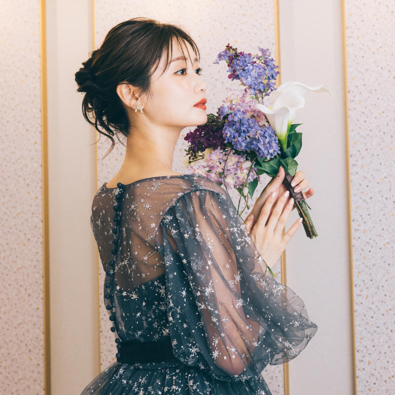 チュールの重なったプリンセスラインのスカートが軽やかに広がる。