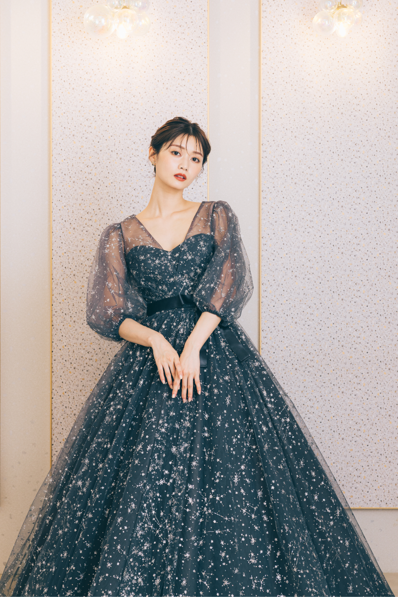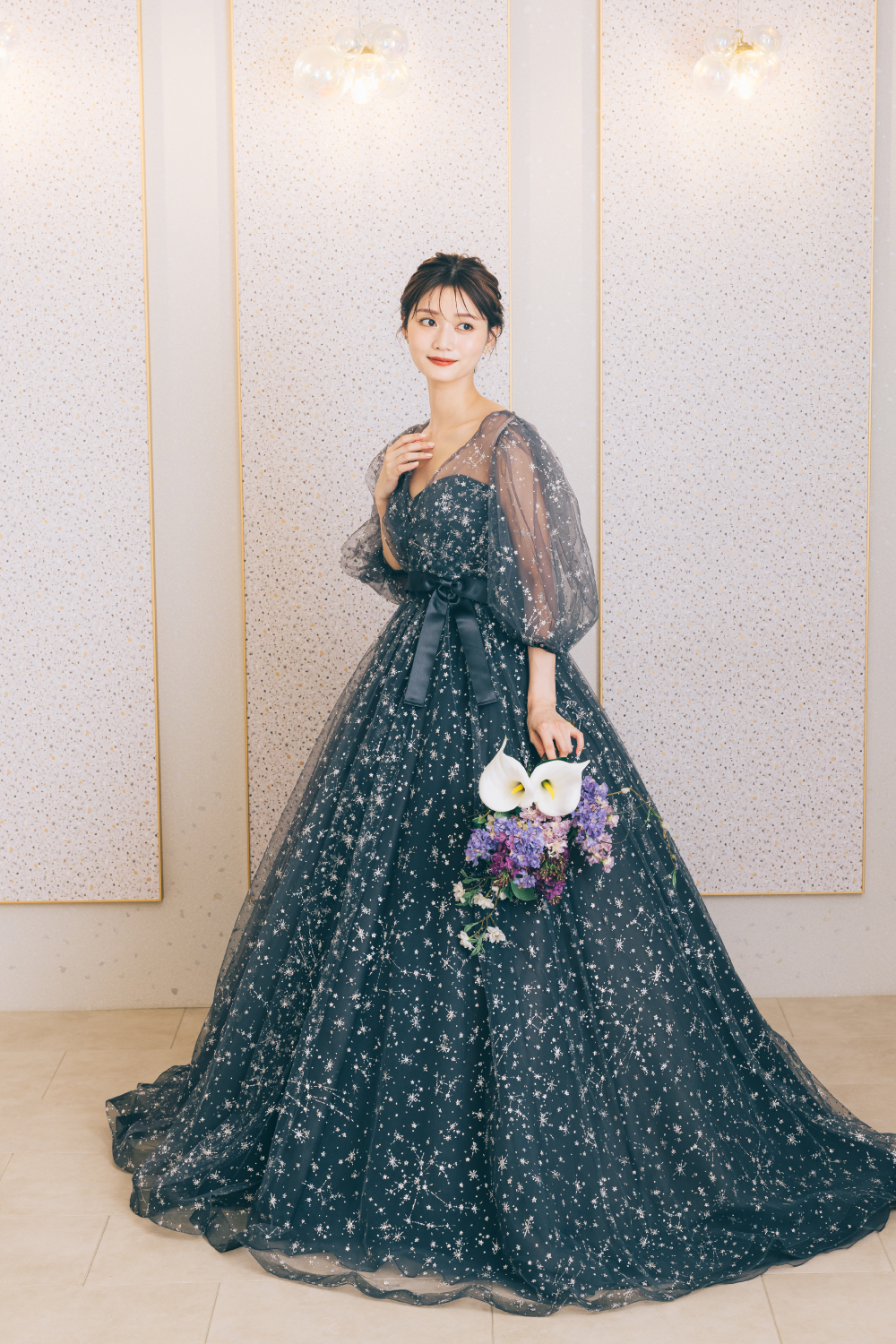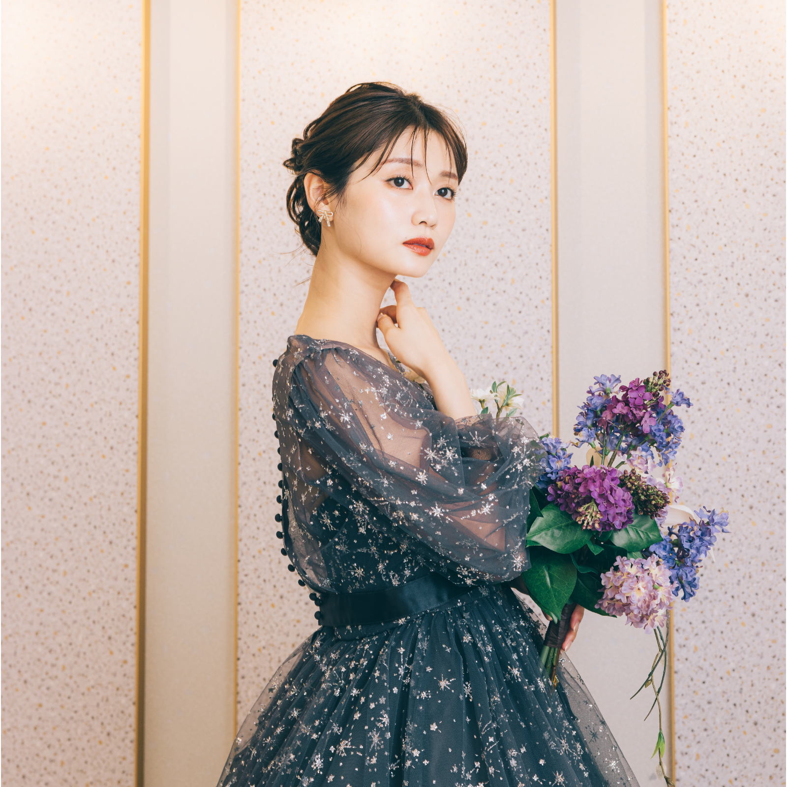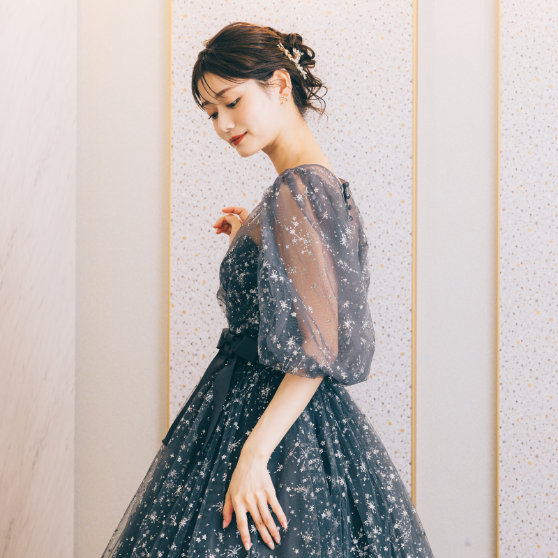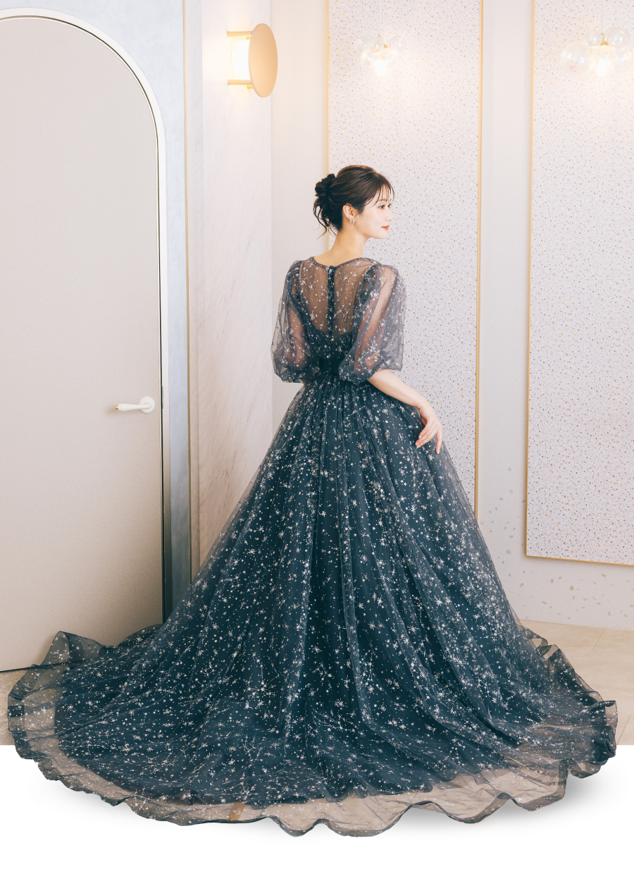 チュールの重なったプリンセスラインのスカートが軽やかに広がる。