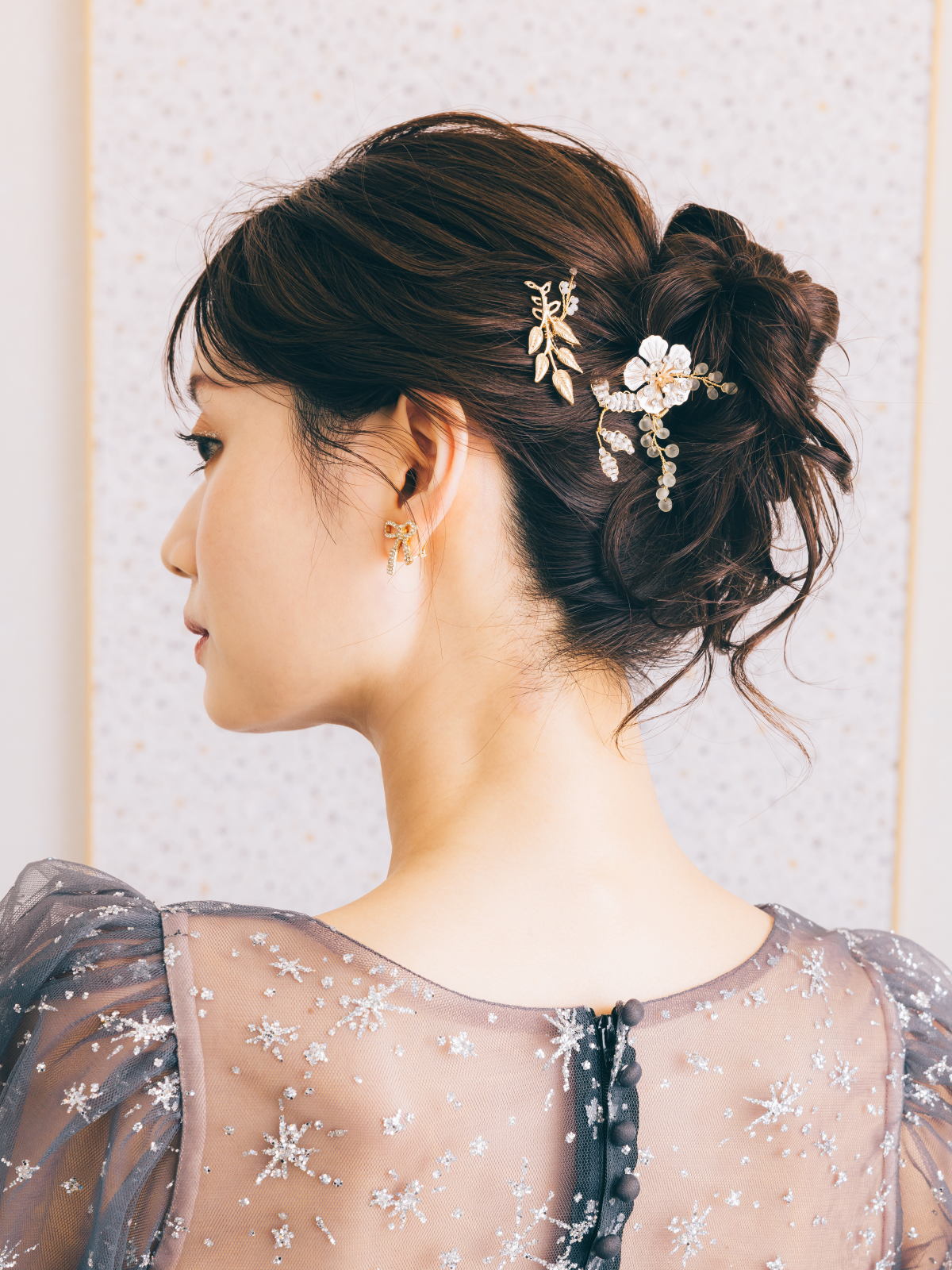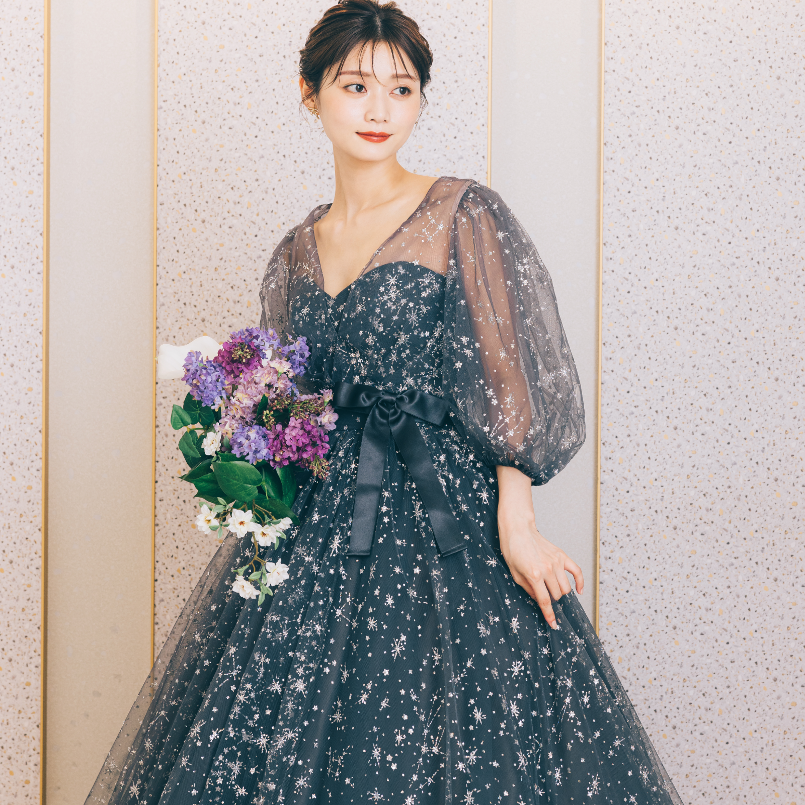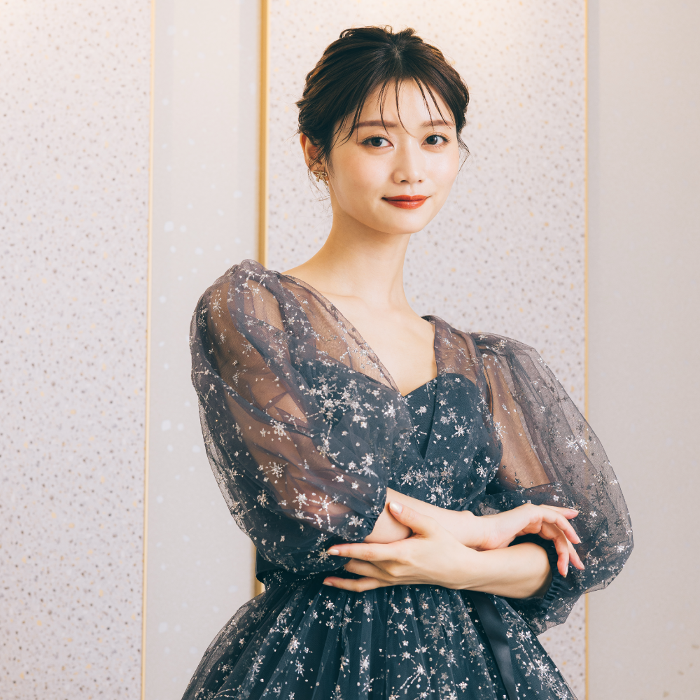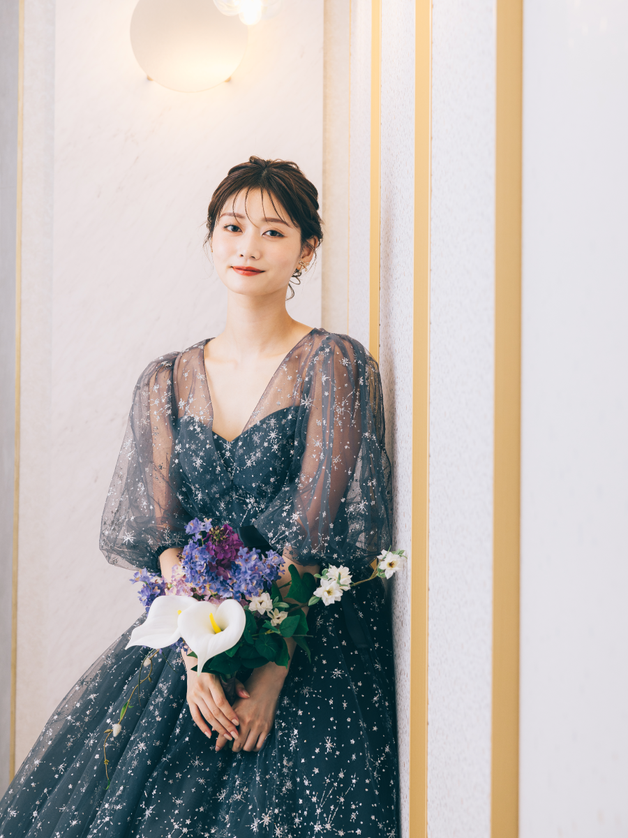 チュールの重なったプリンセスラインのスカートが軽やかに広がる。