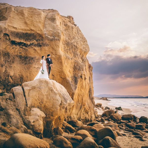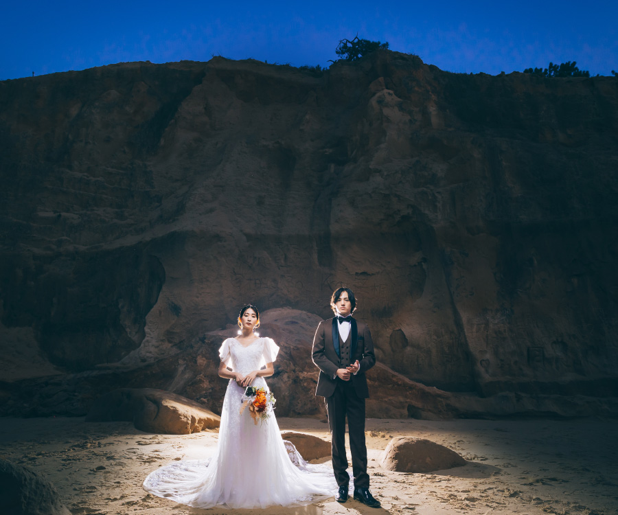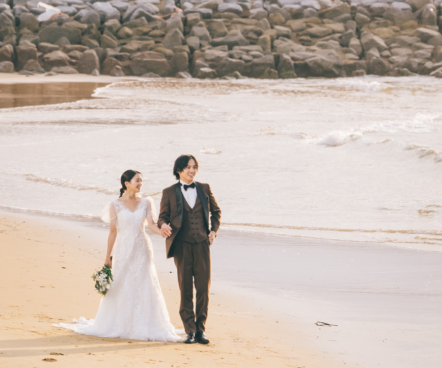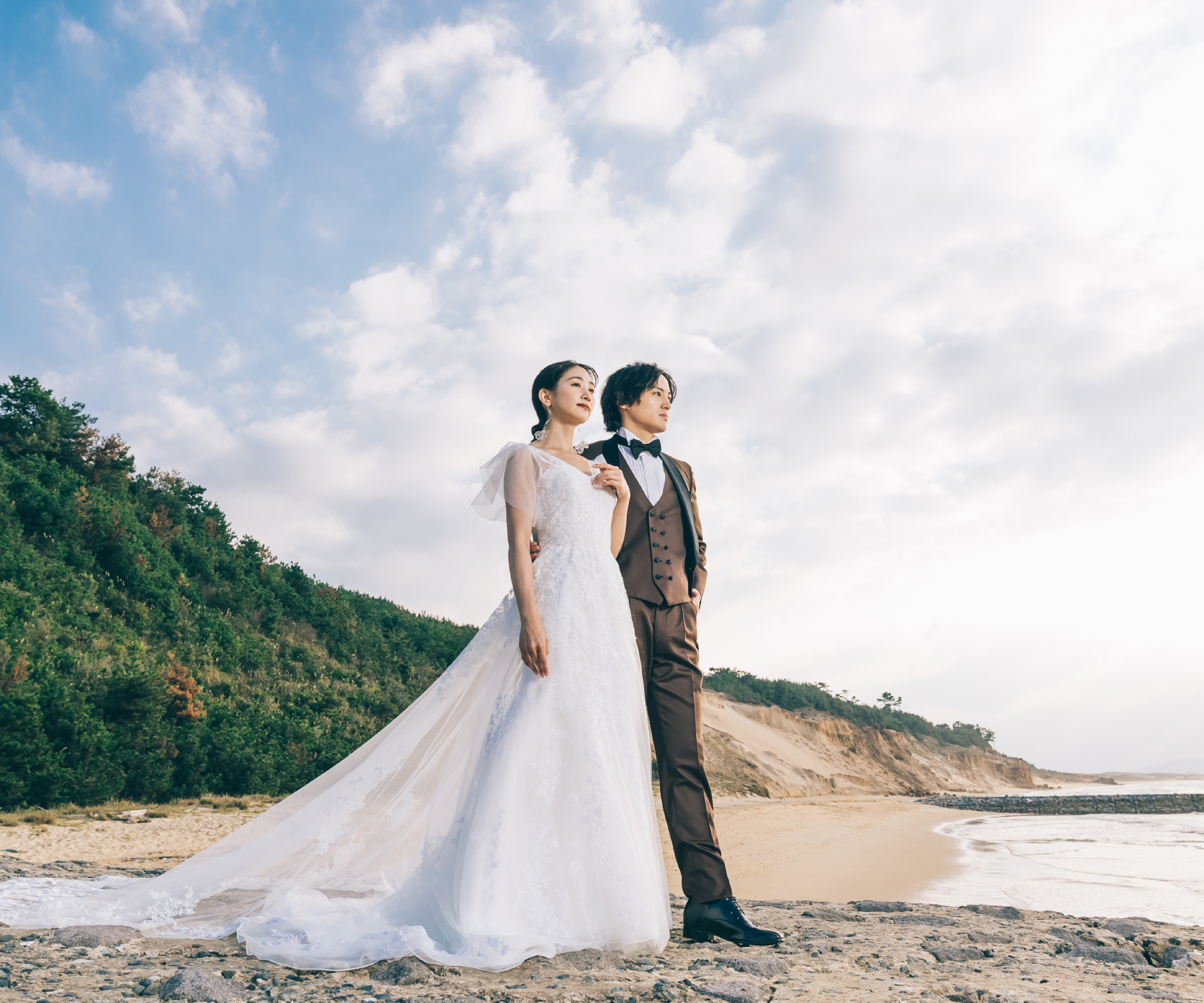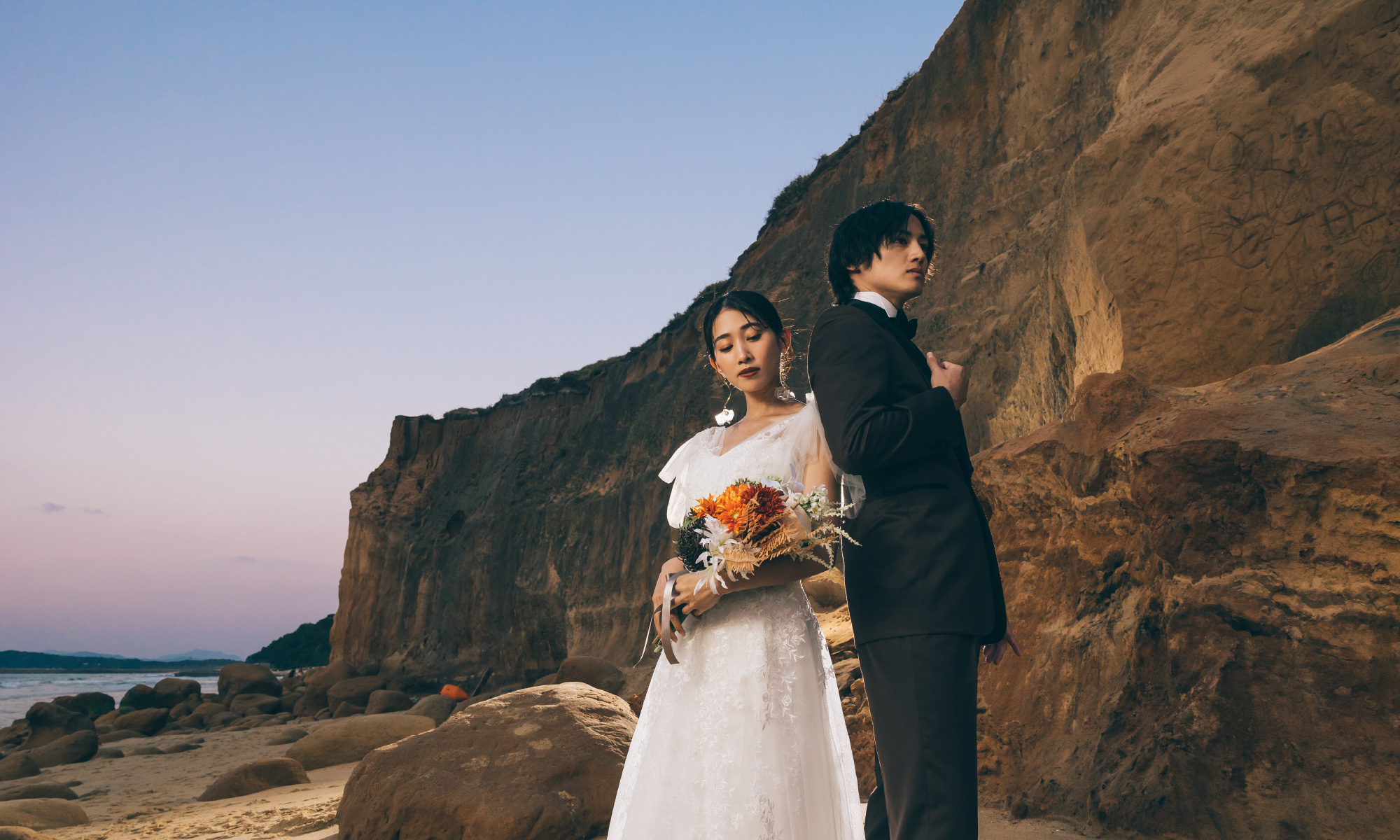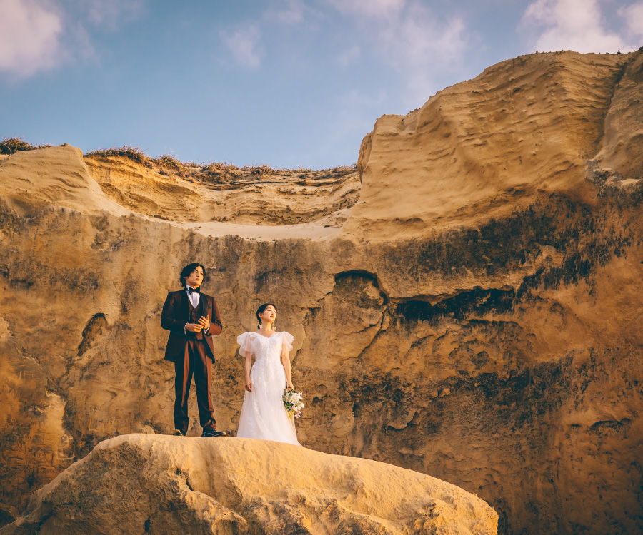 海と大地の自然を楽しみながら撮影できるロケーション。崖の上に立つ海外のようなショットやビーチを仲睦まじく歩く仲良しショットなど様々なシチュエーションで撮ることができます。バリエーション豊かなウェディングフォトを残したいお二人にピッタリのロケーションです。