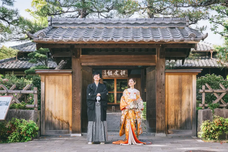 大正時代から受け継がれる3600坪の広大な日本庭園と、崖造り風の和風邸宅が魅力のロケ地。茅葺の門や枯山水などもあり、バリエーション豊かな和装前撮りが叶います。