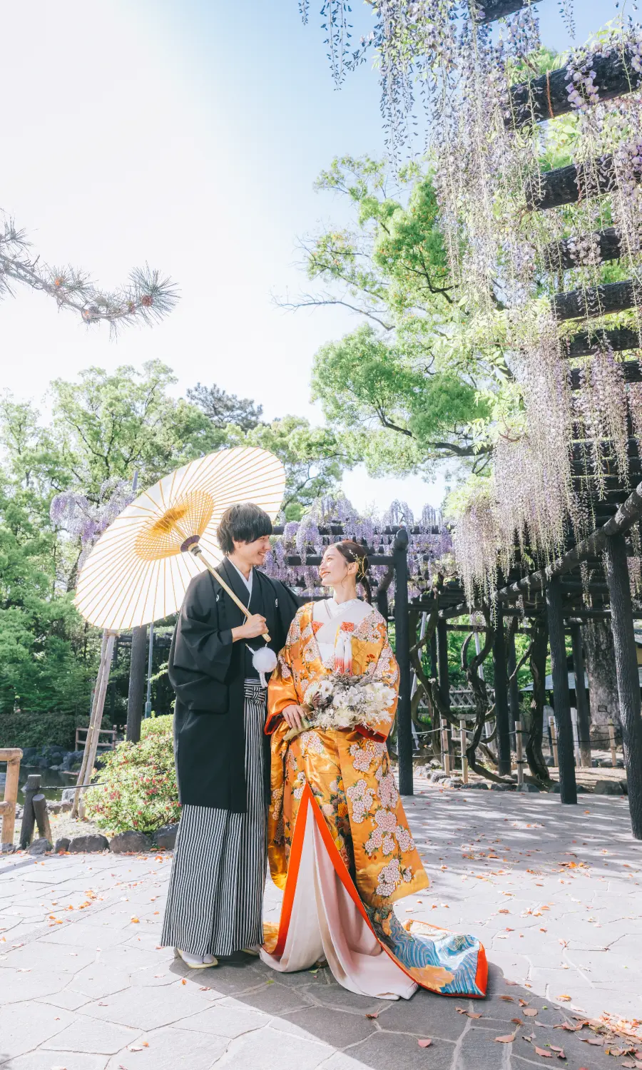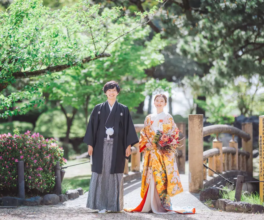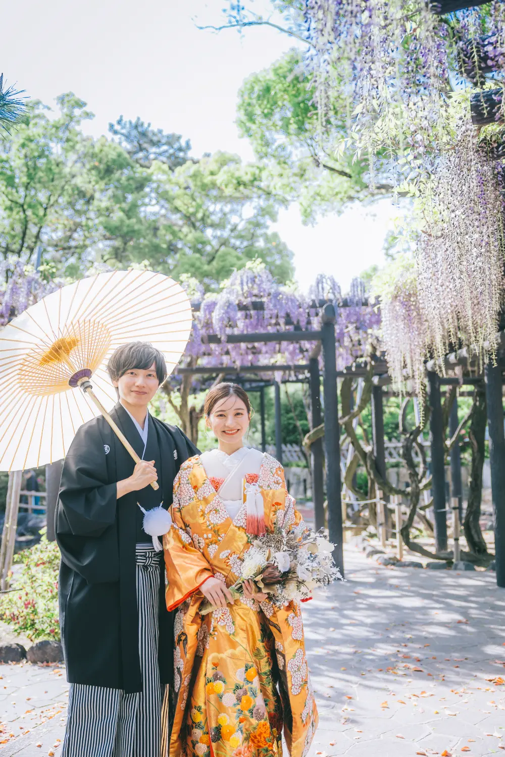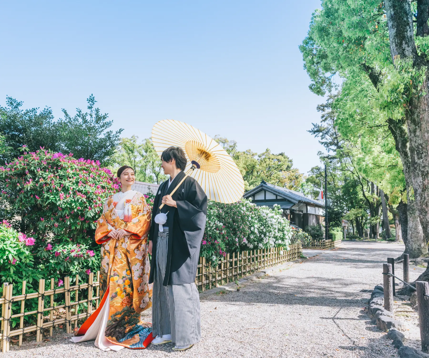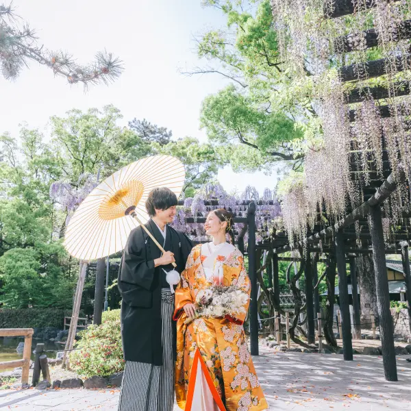 「中村公園」は1885(明治18)年に建てられた豊國神社を中心に整備された純日本風廻遊式林泉庭園をもつ公園です。緑豊かな公園で、四季折々の景色を楽しむことができます。藤の木の名所としても知られる中村公園での和装前撮りはいかがでしょうか。