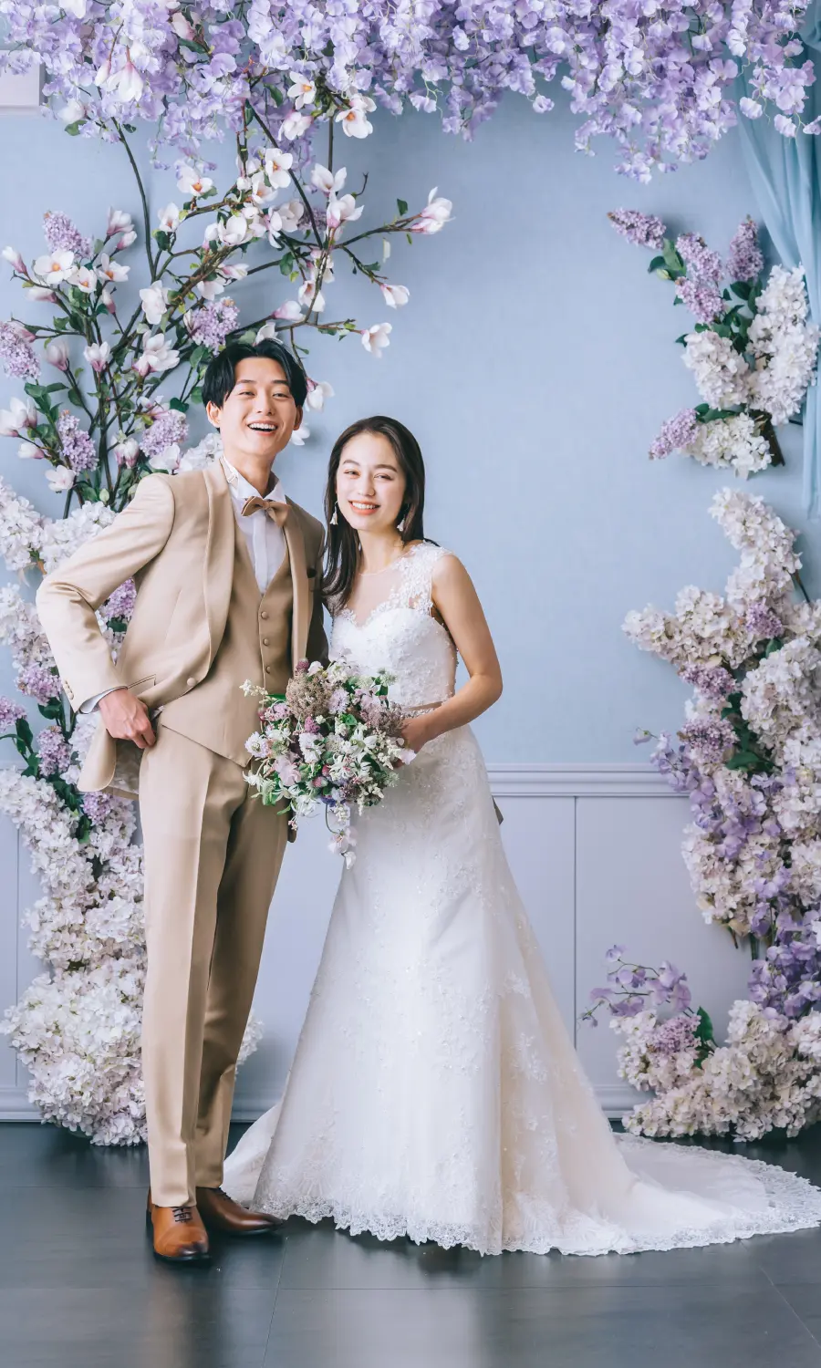 月日が流れるほど価値が高まっていく。それがウェディングフォト。30年後にアルバムを開いた時にも、素敵な二人であるために、背景セットには特にこだわっています。