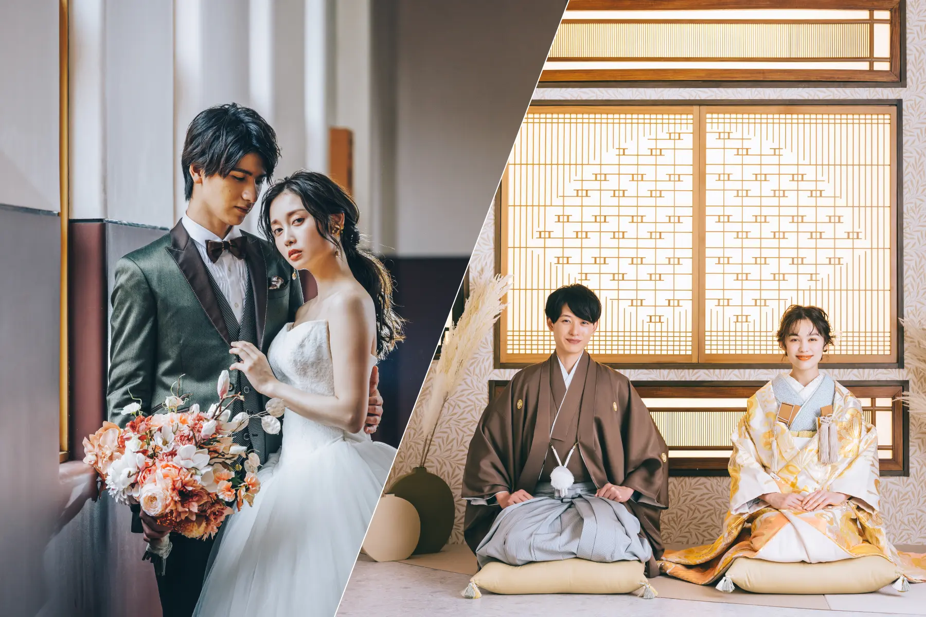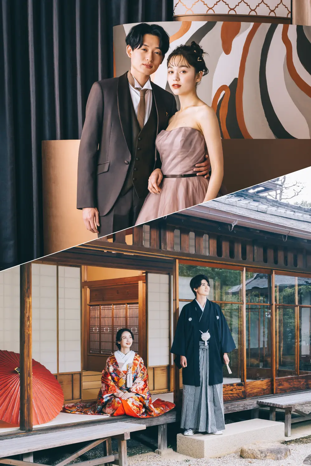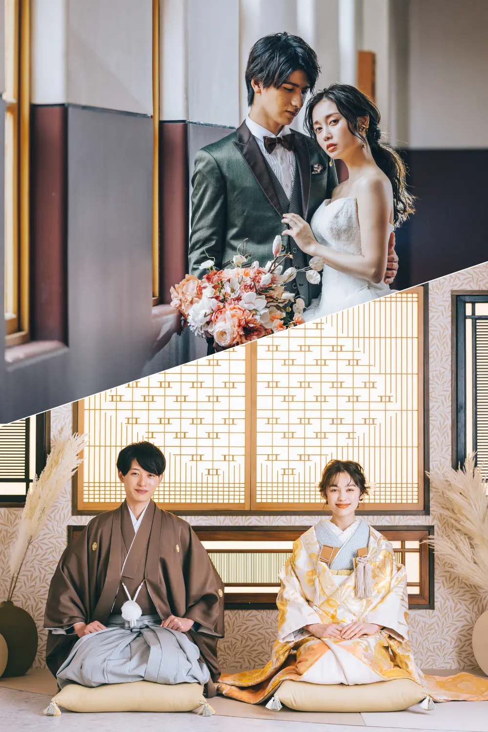大切な人と一緒に写すウェディングフォトだから、お洒落には徹底的にこだわりたい。écrinのスタジオ+ロケプランなら追加料金なしでお好みの衣裳を2着選べます。