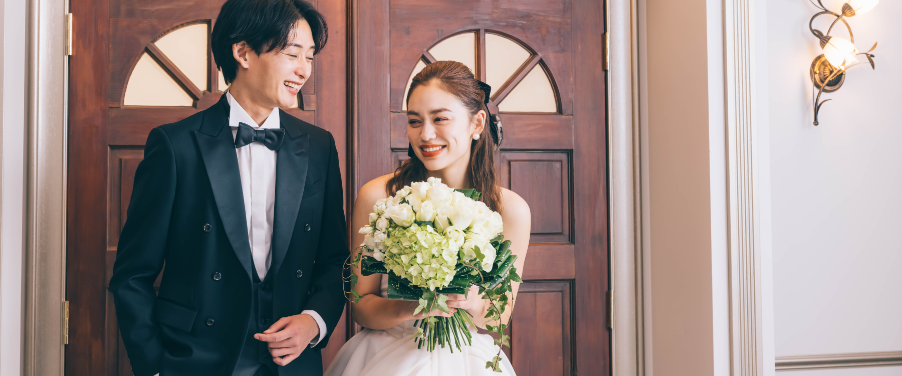 お二人の新たな門出を意味するアンティーク扉が印象的なセット。美しく輝くシャンデリアとペンダントライトがシックなウェディングフォトを演出します。