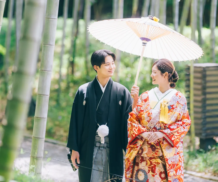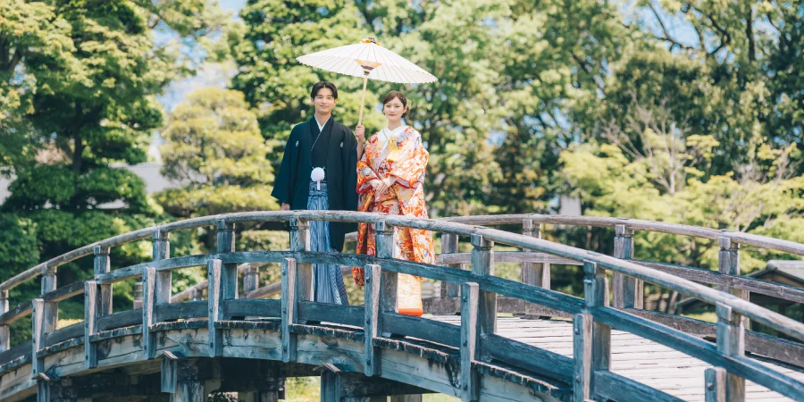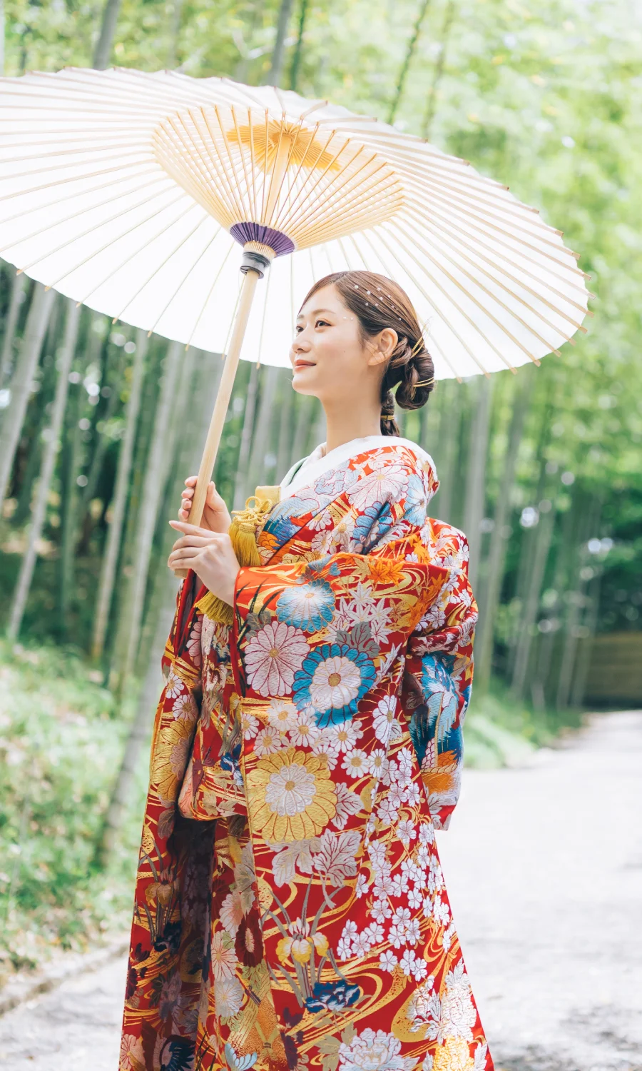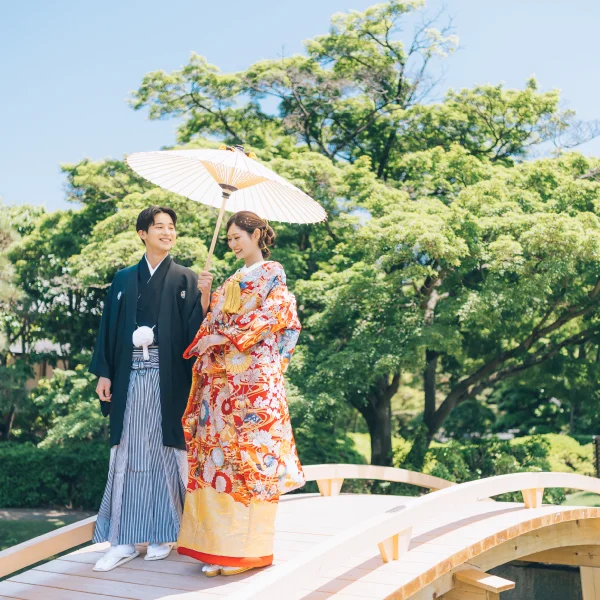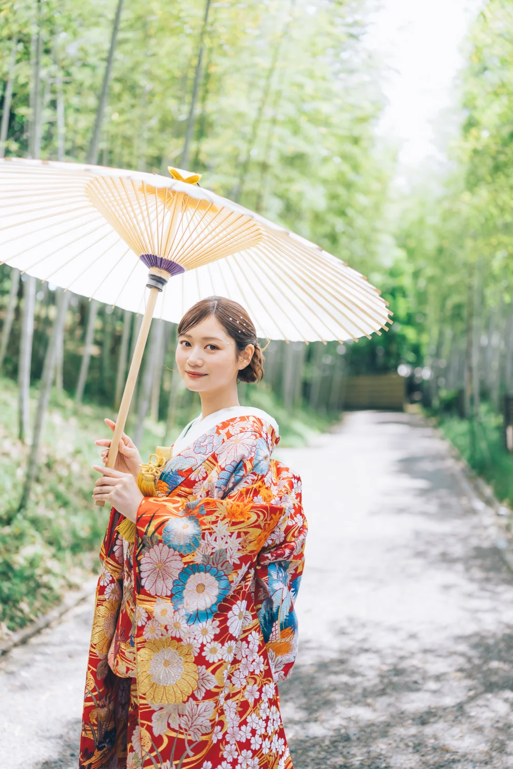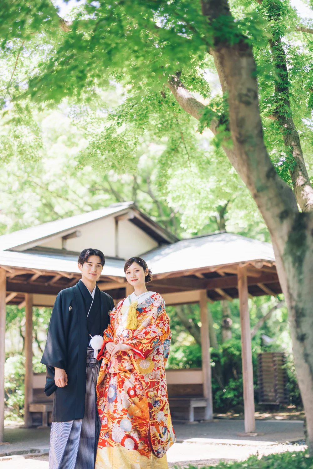 埼玉県越谷市にある花田苑は、桜・新緑・紫陽花・紅葉・梅と、四季折々の彩りが魅力のロケーション。池を中心に、木橋や茶室、竹林もあり、風情ある景色の中で、伝統的な和装フォトが叶います。