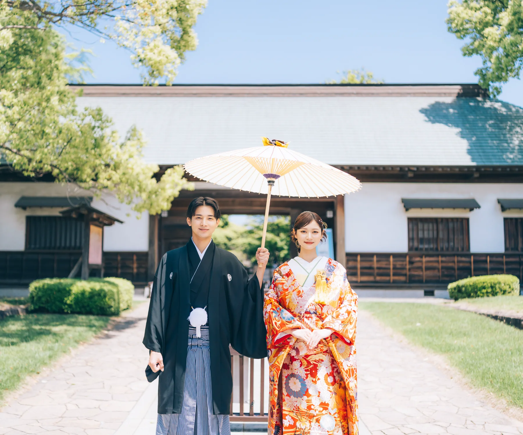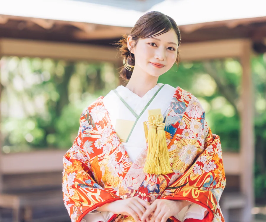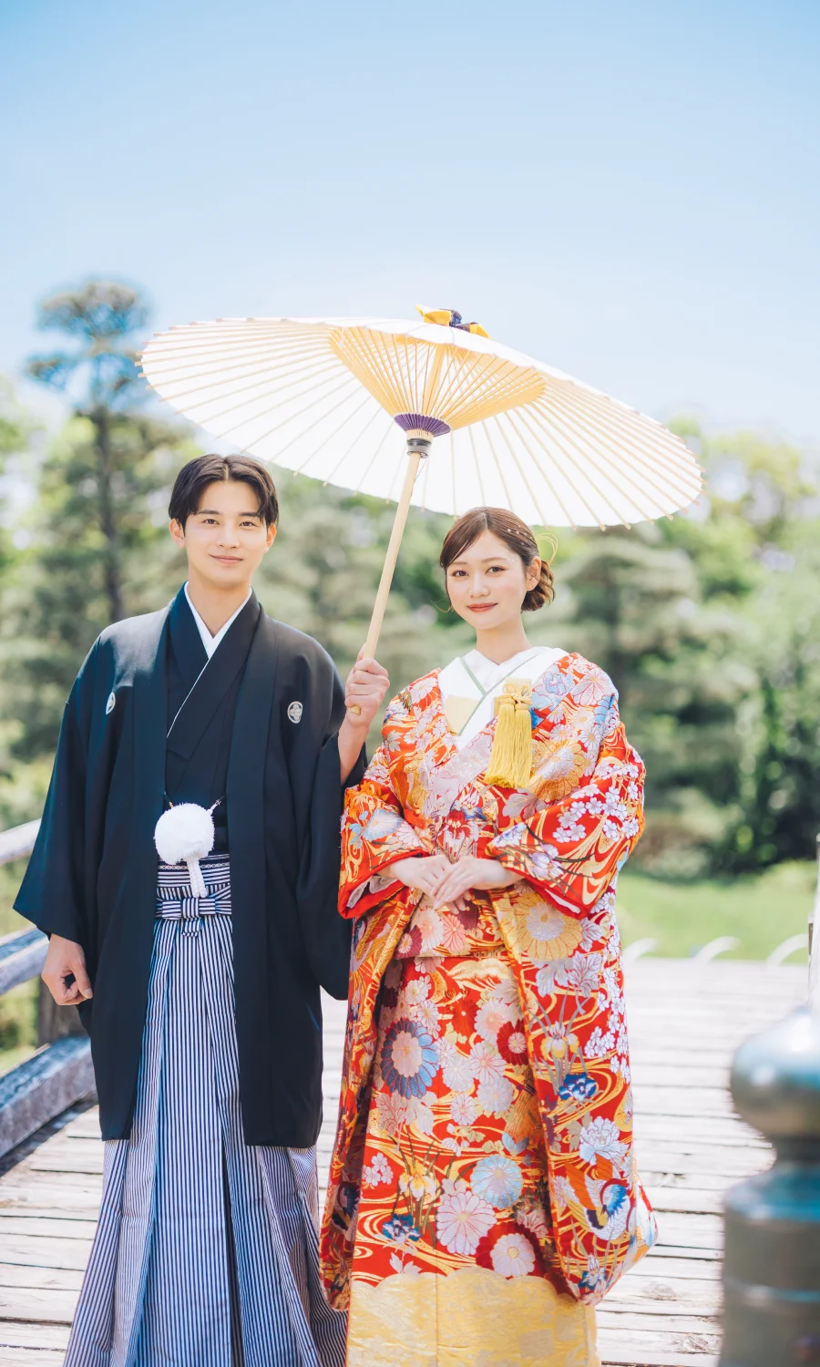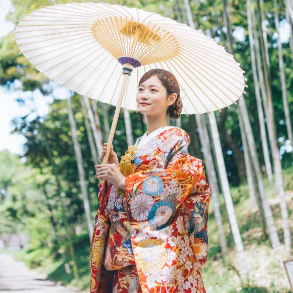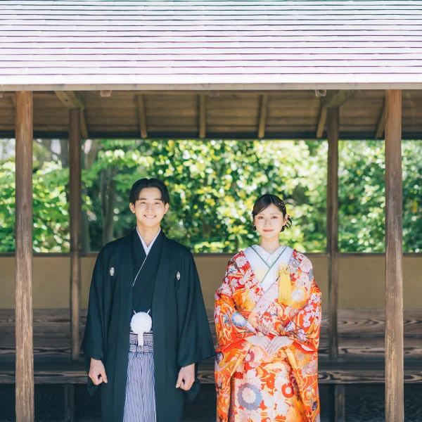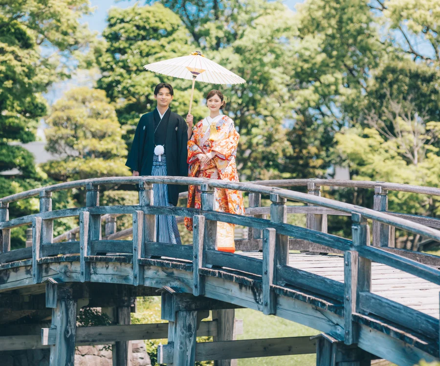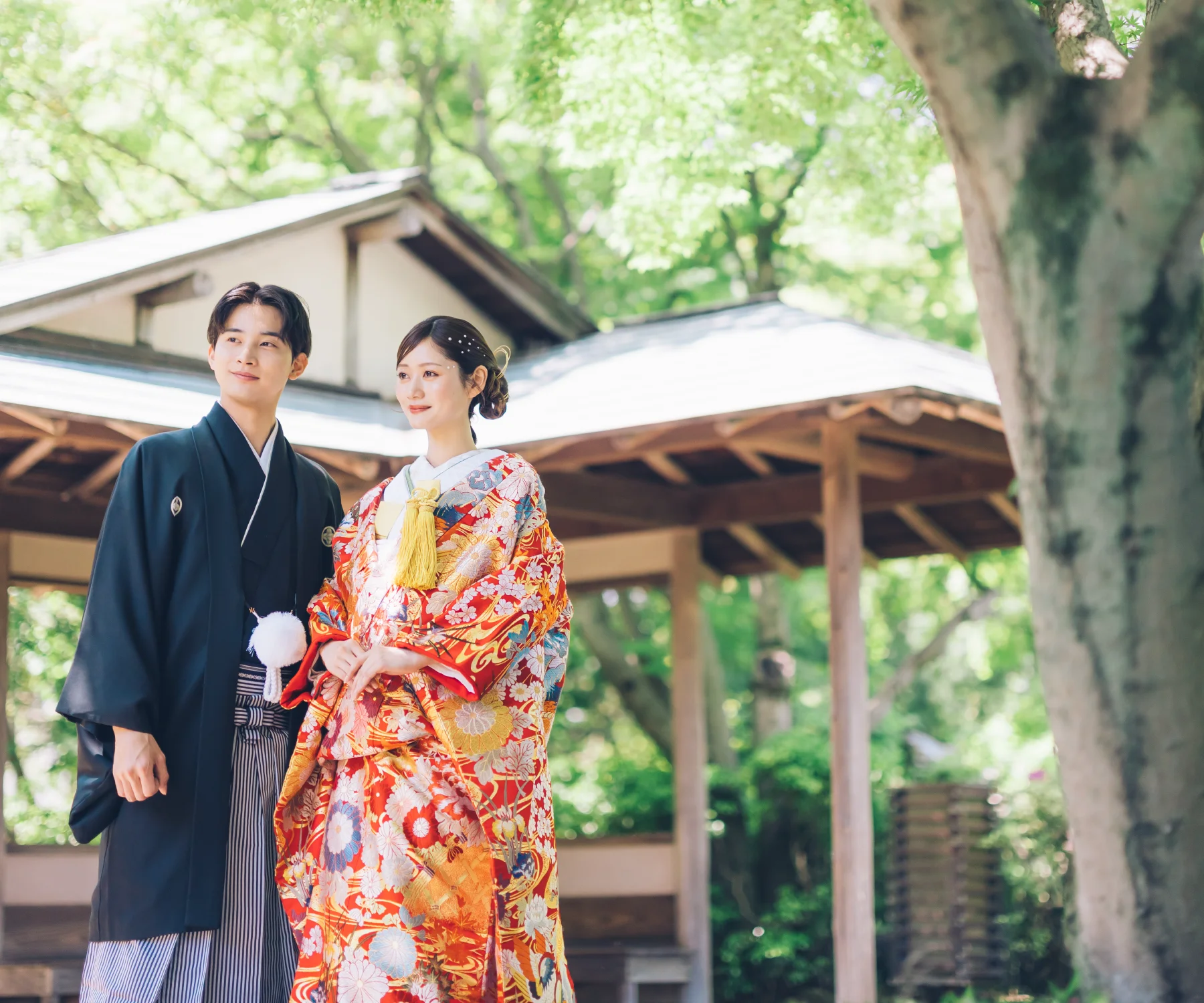 埼玉県越谷市にある花田苑は、桜・新緑・紫陽花・紅葉・梅と、四季折々の彩りが魅力のロケーション。池を中心に、木橋や茶室、竹林もあり、風情ある景色の中で、伝統的な和装フォトが叶います。