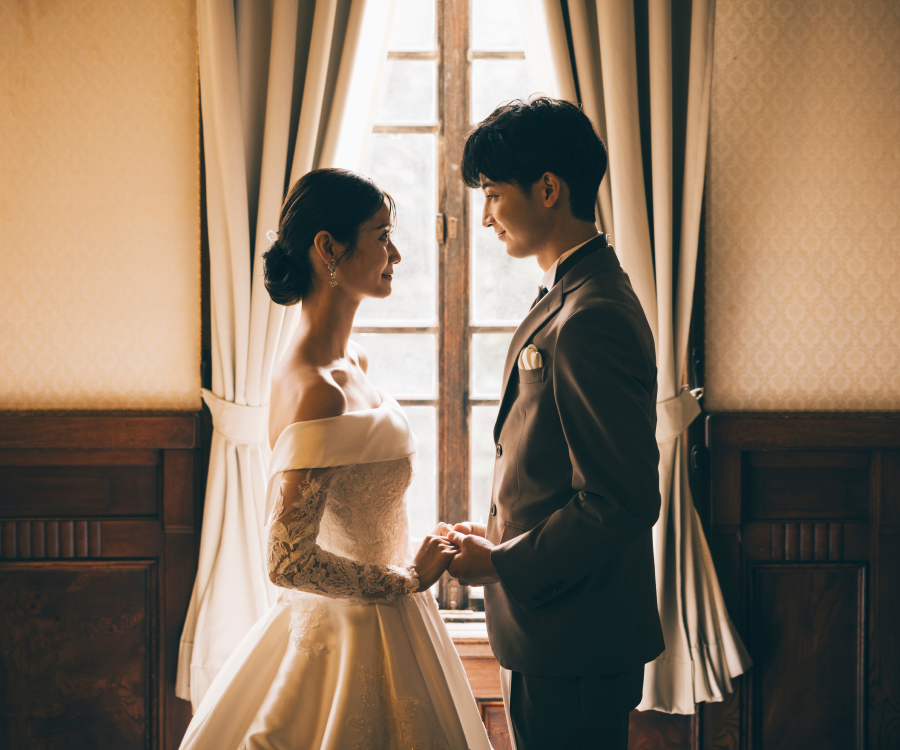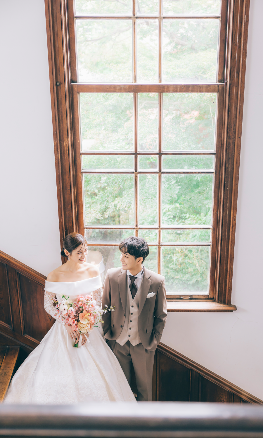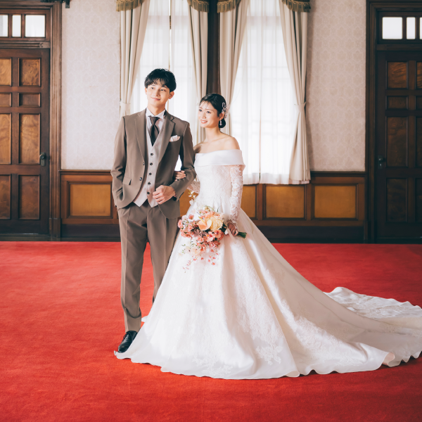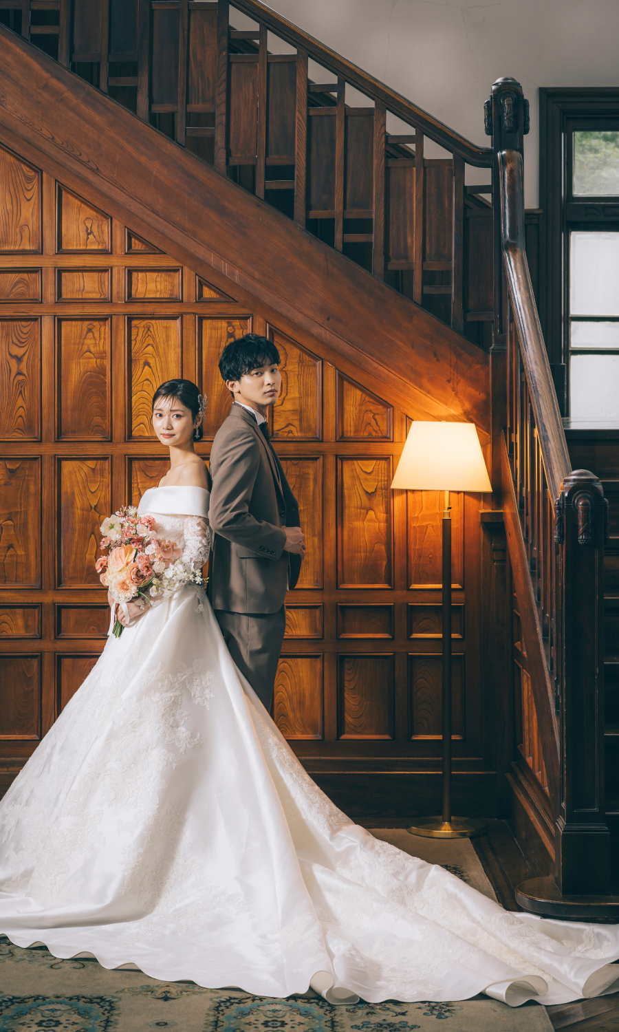 大正時代に建てられた和洋折衷の西洋建築は、フォトウェディングにぴったりのロケーション。ルネサンス様式を基調とした優雅なデザイン、赤レンガと漆喰の外観、繊細な装飾が施された室内、そして日本庭園が織りなす景観が、時を超えた美しさを結婚写真に刻みます。