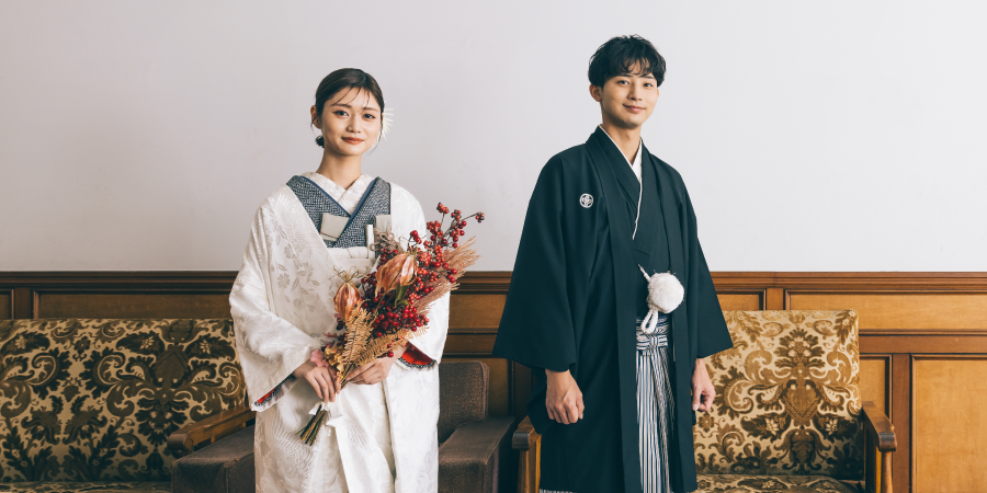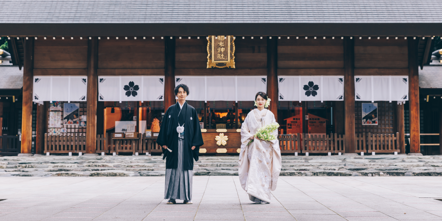 櫻木神社は、歴史が息づく社殿や荘厳な神門、心落ち着く静かな境内が魅力。光と影が織りなす回廊、趣深い手水舎、整然とした参道など、どこを切り取っても絵になる美しさが広がり、格調高いウェディングフォトが叶います。