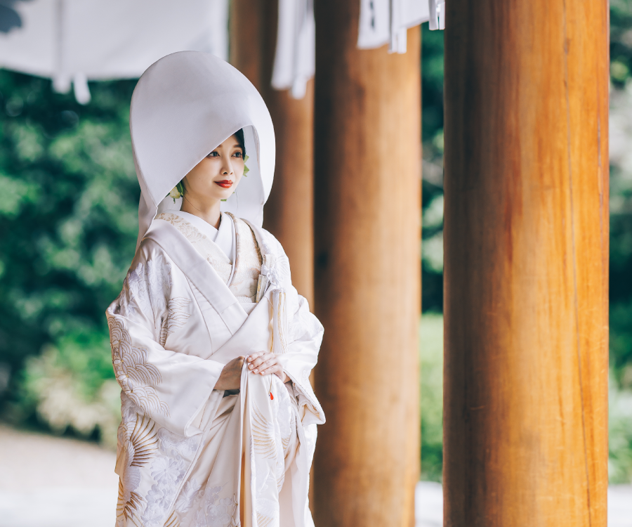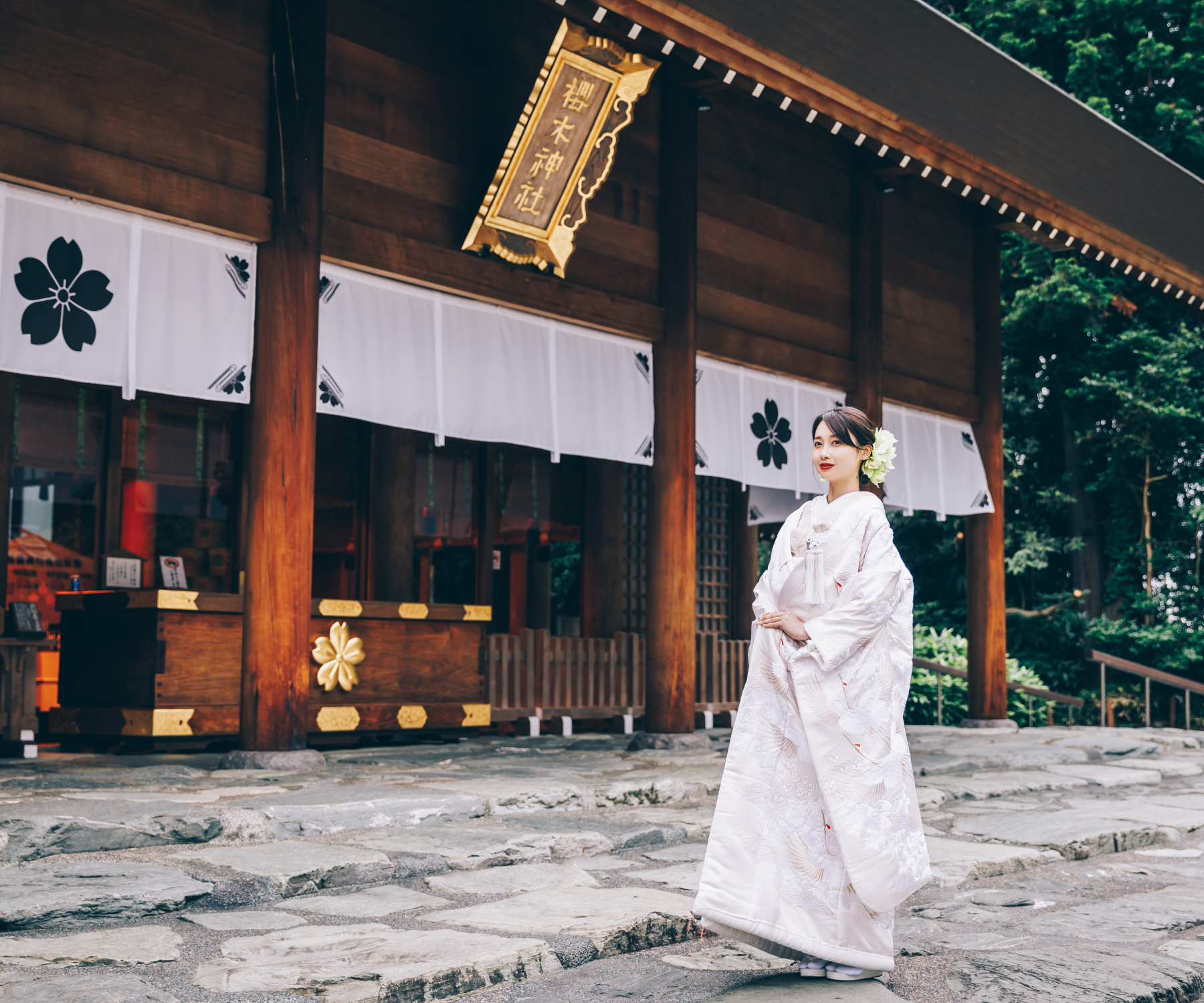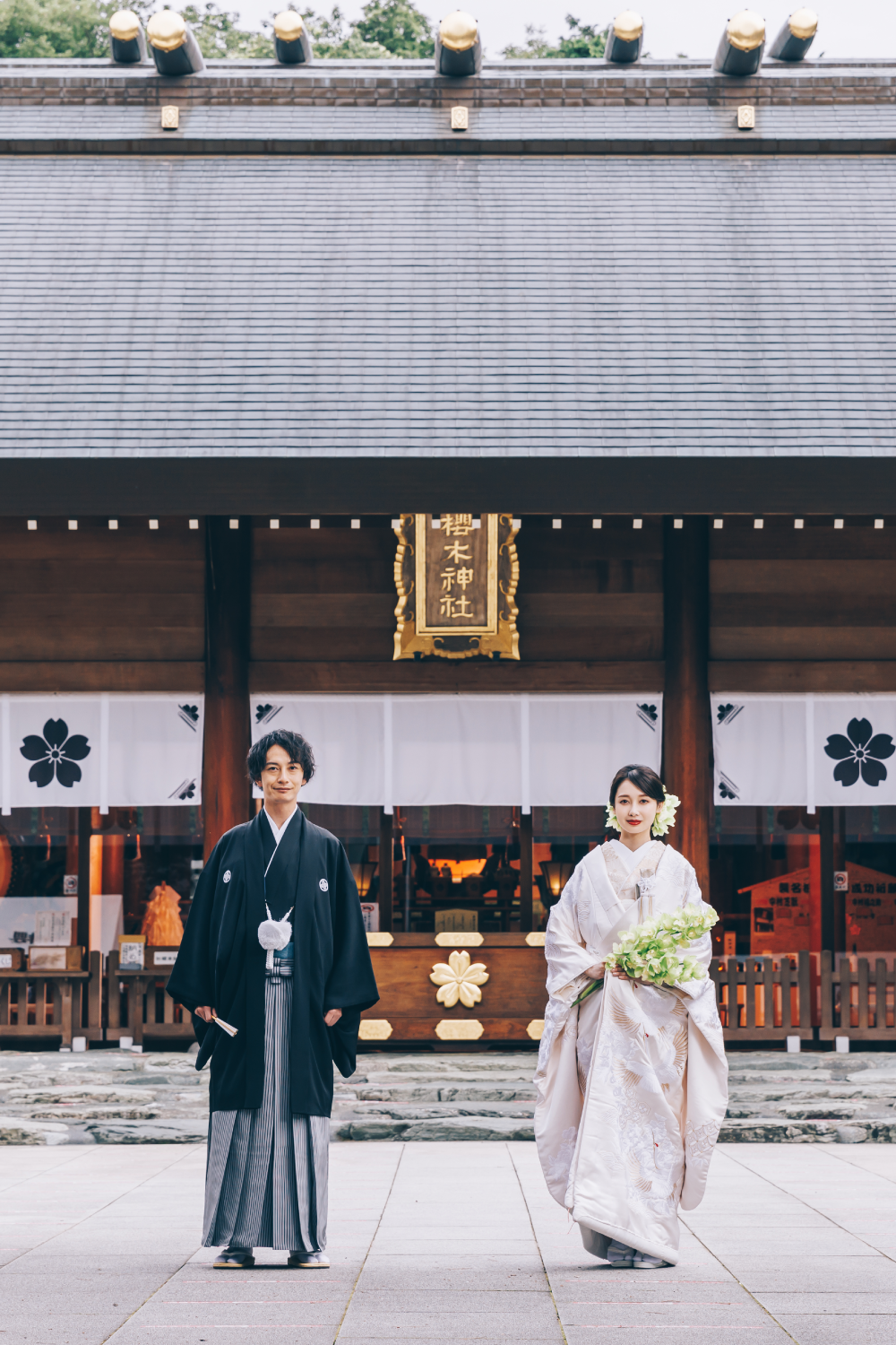 櫻木神社は、歴史が息づく社殿や荘厳な神門、心落ち着く静かな境内が魅力。光と影が織りなす回廊、趣深い手水舎、整然とした参道など、どこを切り取っても絵になる美しさが広がり、格調高いウェディングフォトが叶います。