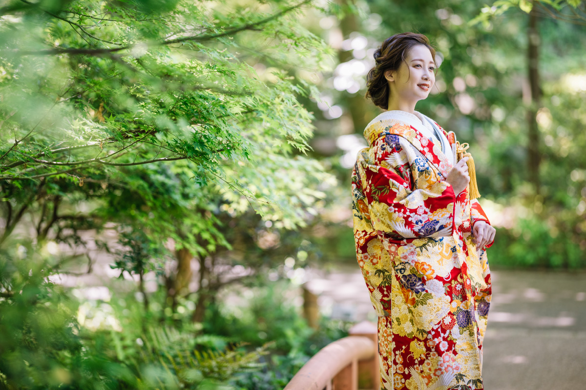 ロケーションフォトにおすすめの色打掛・白無垢をご紹介。人気ゲストハウスの結婚式でも使われる本物の和装のクオリティをお楽しみください。