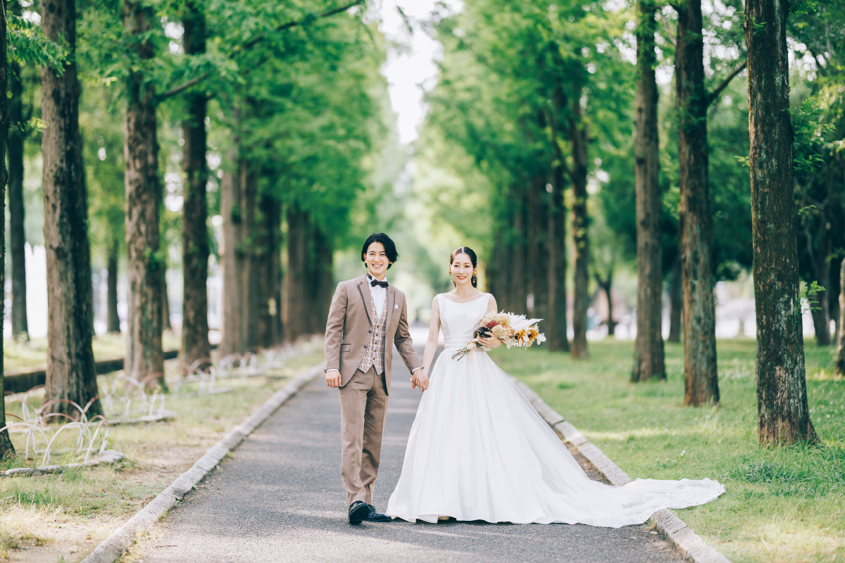 淡い緑色が美しい新緑は、木々の種類により芽吹きの時期が変化します。そんな新緑のベストスポットを熟知したスタッフが同行するため、春らしい結婚写真を残せます。
