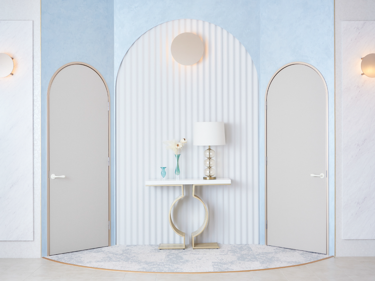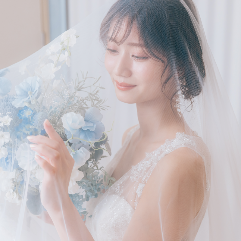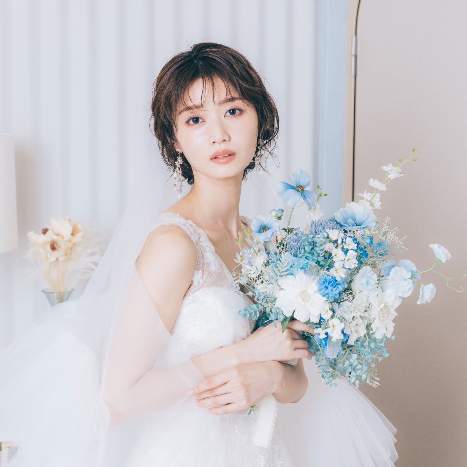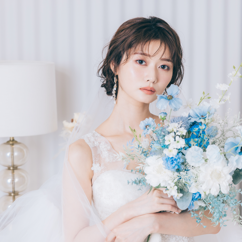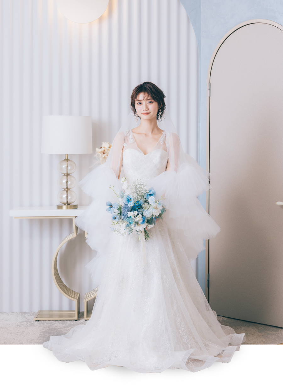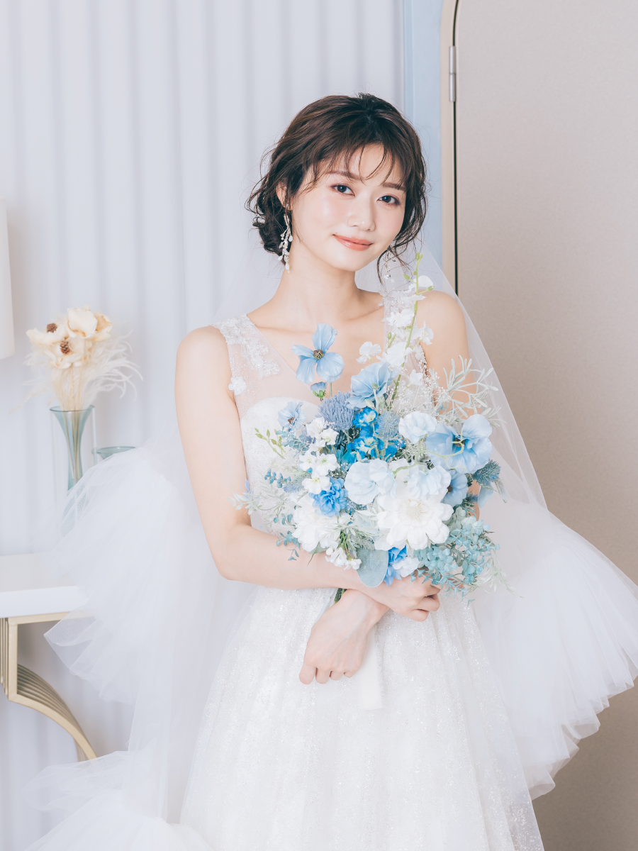 真っ白なドレスに鮮やかなブルーのアクセントを。