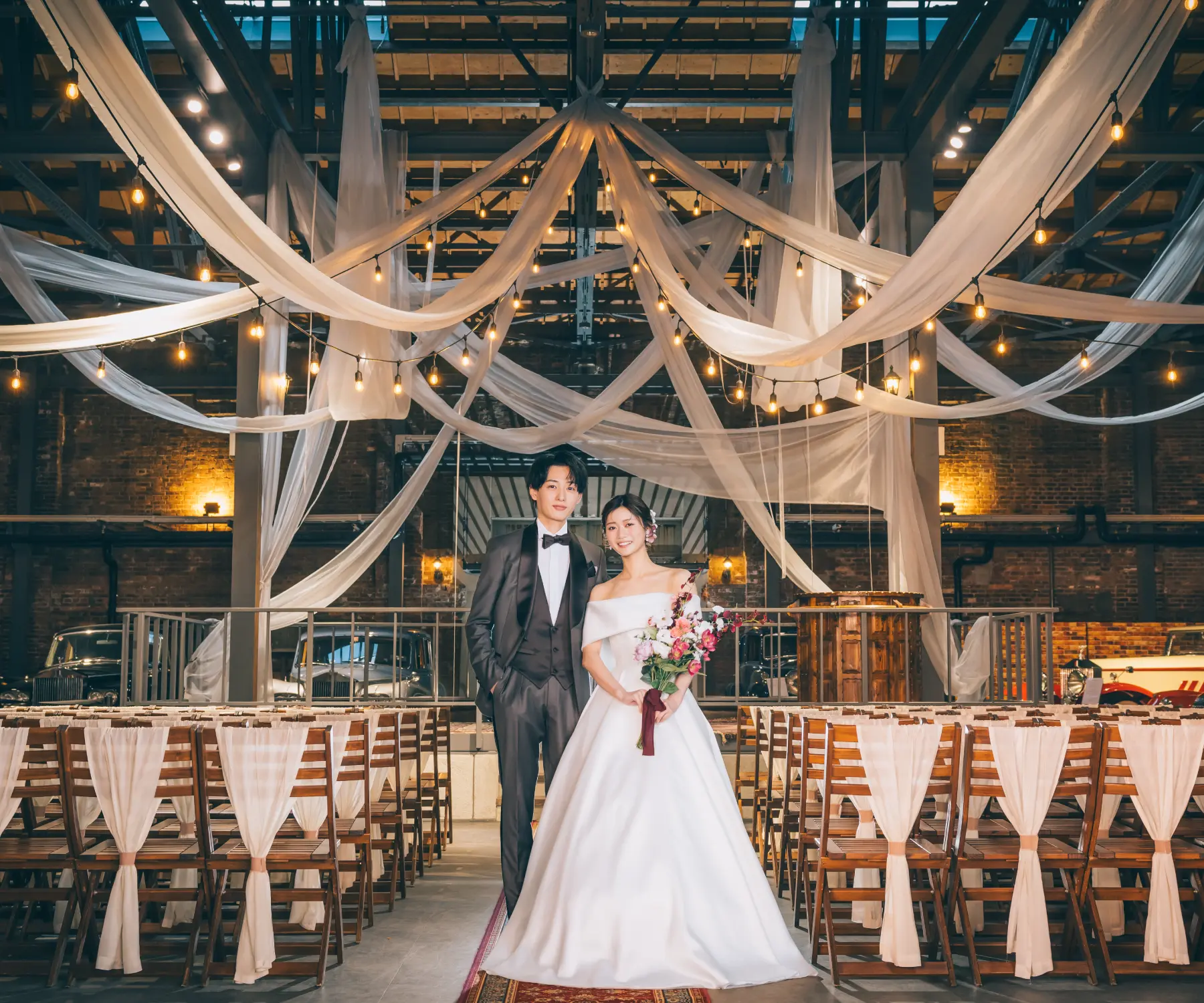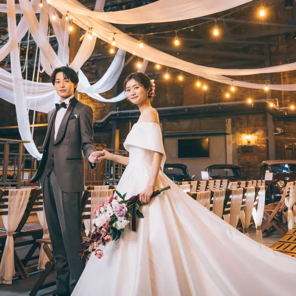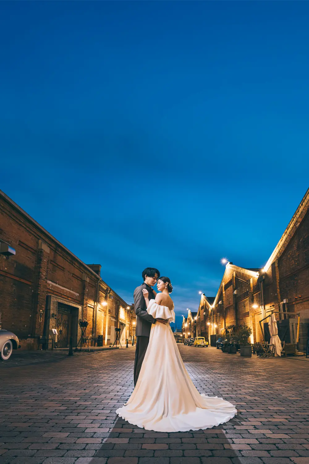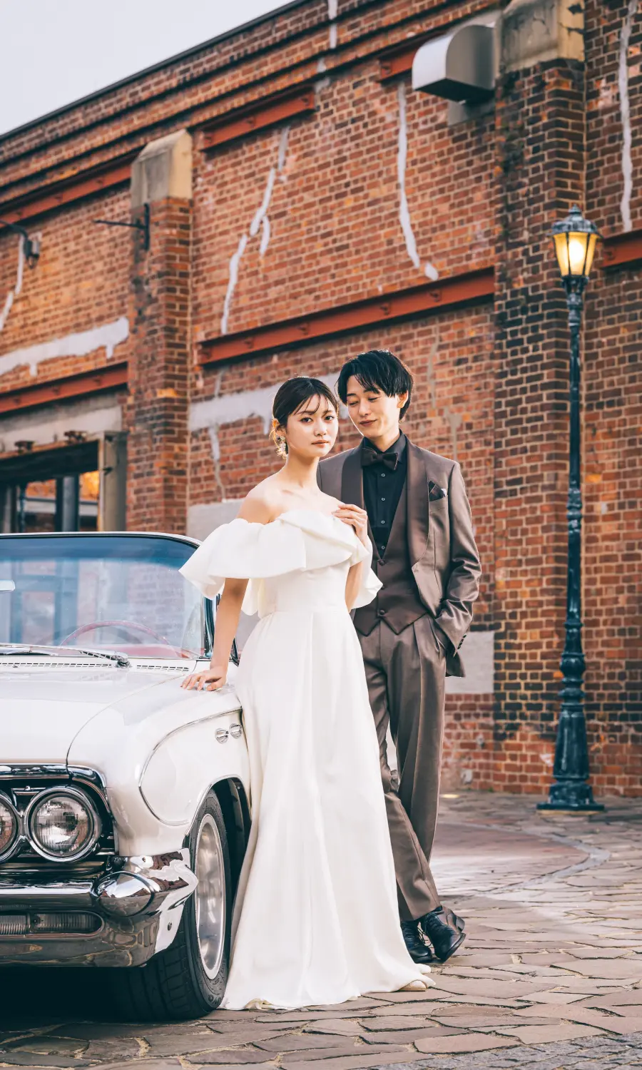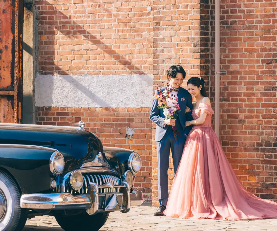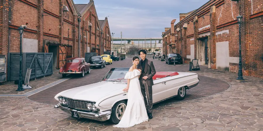 大阪港の赤レンガ倉庫は、歴史あるレンガ造りが印象的なロケーション。クラシックカーが並ぶレンガの街並みは、まるで映画のワンシーンのよう。優雅で気品あふれる写真を残せる、大人のウェディングフォトにふさわしい特別な舞台です。
