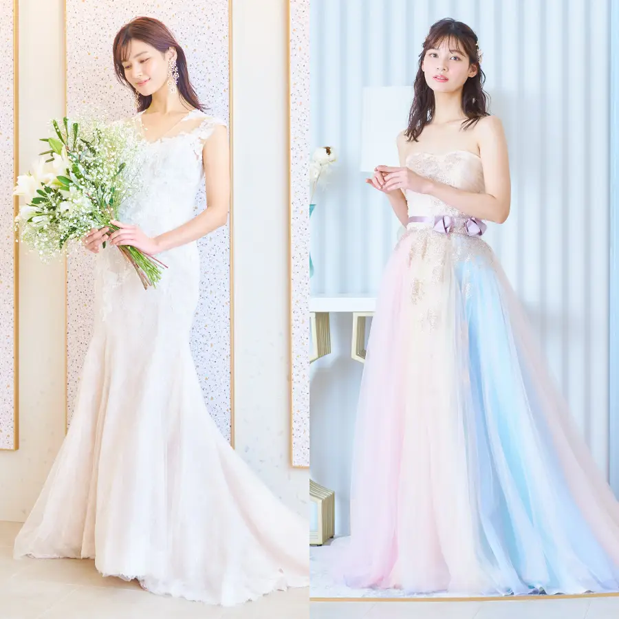 大切な人と一緒に写すウェディングフォトだから、お洒落には徹底的にこだわりたい。écrinのスタジオ+ロケプランなら追加料金なしでお好みの衣裳を2着選べます。