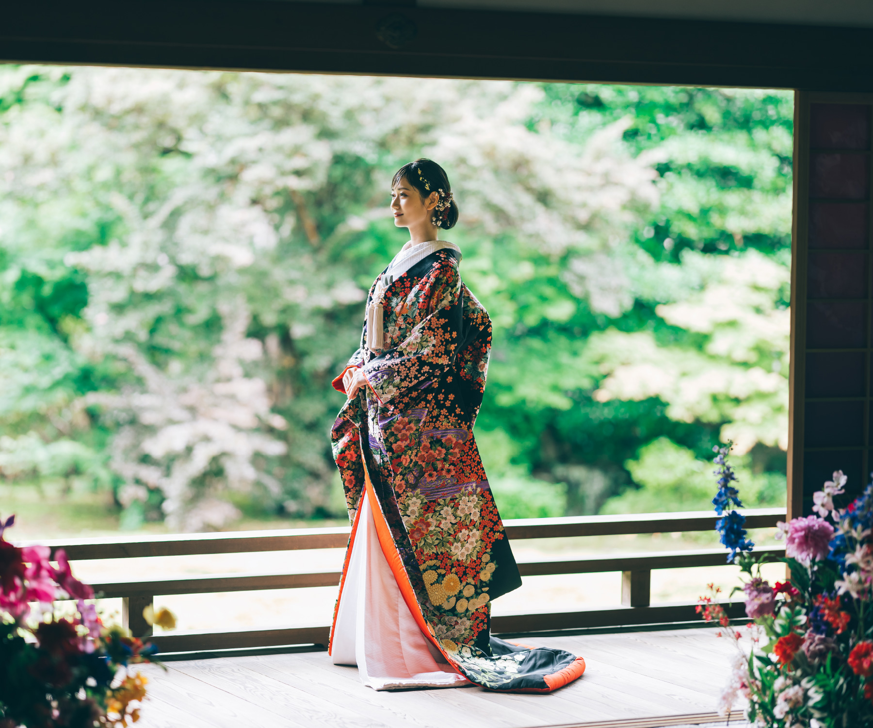 一生に一度のウェディングフォトだから、妥協したくない憧れの和装撮影。 écrinでは上質な和装色打掛・白無垢を豊富にご用意しております。ロケ地のイメージに合わせて、お洒落に小物の色使いを変えてもOK!衣装にこだわった和装ロケーション撮影をお楽しみ下さい。
