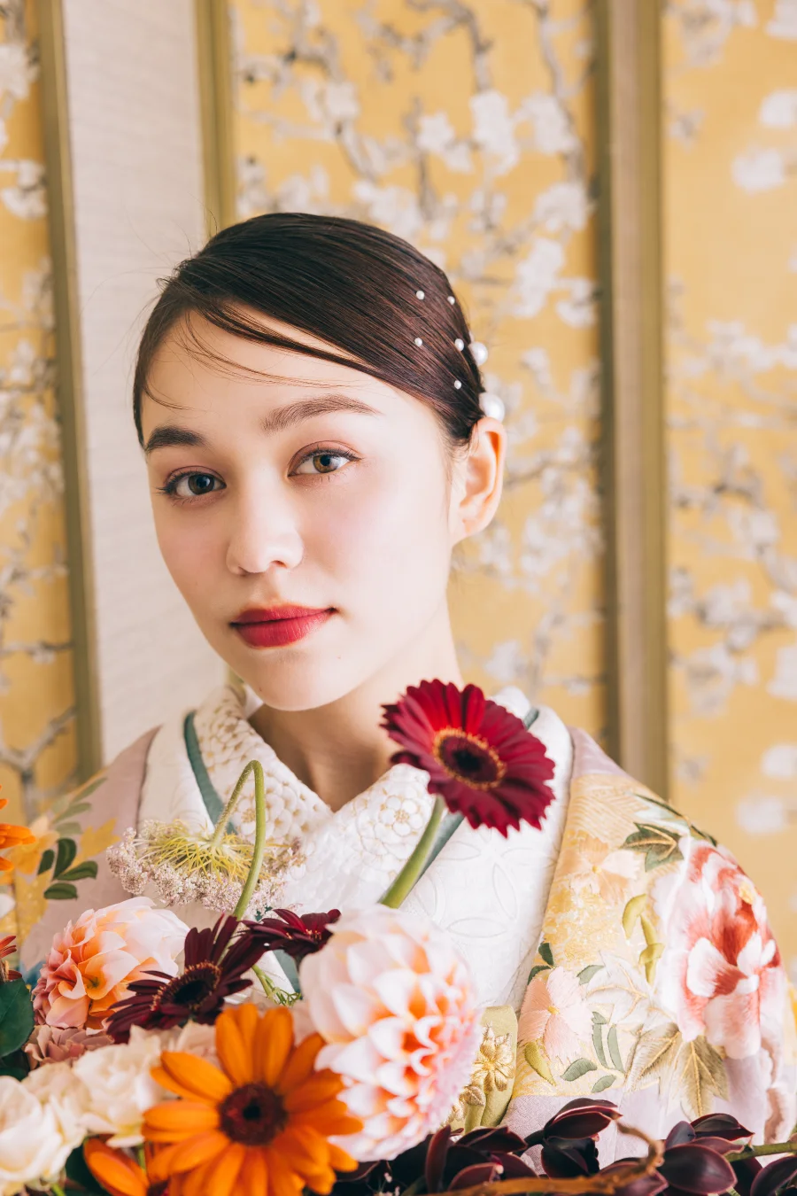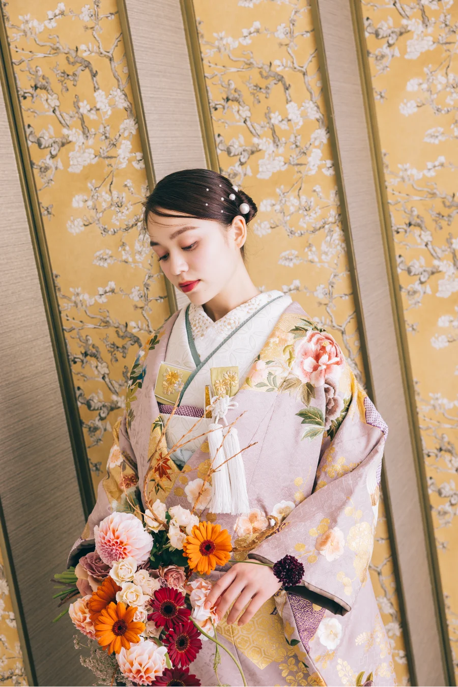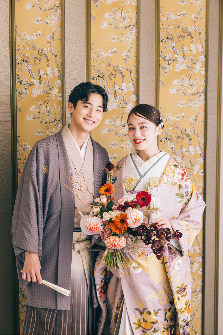 スタジオの一角は、凛とした伝統美を感じる和の空間。その中でひときわ存在感のある金屏風。左半分は屏風絵は、日本画の影響を強く受けたことで知られるゴッホの筆によるもの。梅と鶴の吉祥文様がウェディングフォトに彩を添えています。右半分は堂々とした広幅の屏風に質感のあるゴールドを上品に配置。ウェディングドレスと屏風を組み合わせたオリエンタルなテイストも新鮮です。