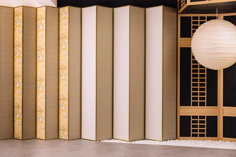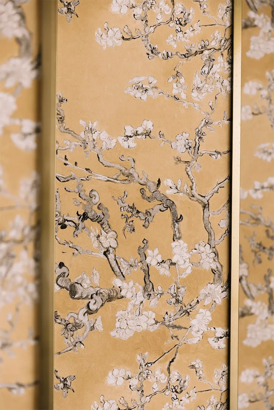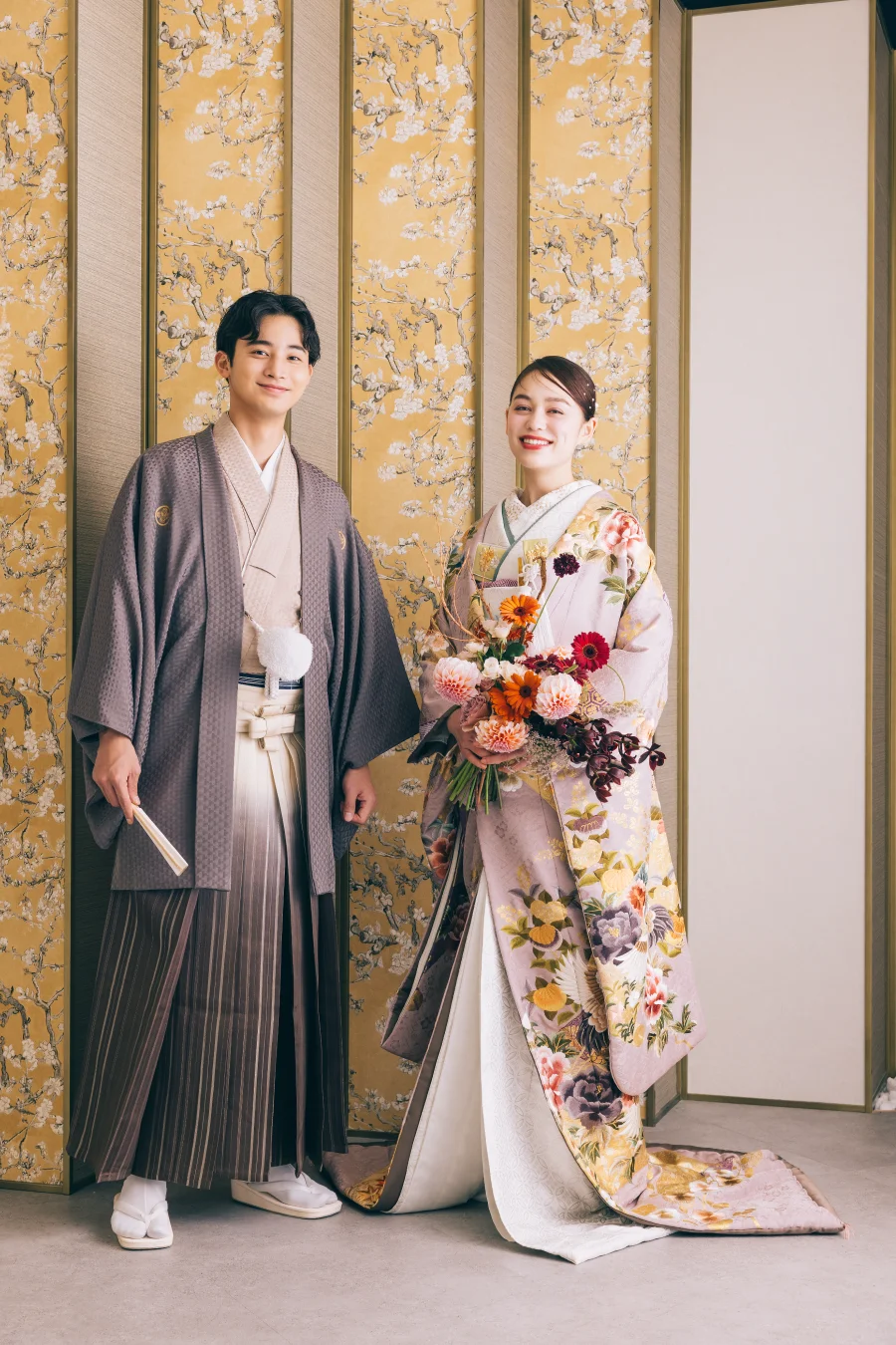 スタジオの一角は、凛とした伝統美を感じる和の空間。その中でひときわ存在感のある金屏風。左半分は屏風絵は、日本画の影響を強く受けたことで知られるゴッホの筆によるもの。梅と鶴の吉祥文様がウェディングフォトに彩を添えています。右半分は堂々とした広幅の屏風に質感のあるゴールドを上品に配置。ウェディングドレスと屏風を組み合わせたオリエンタルなテイストも新鮮です。