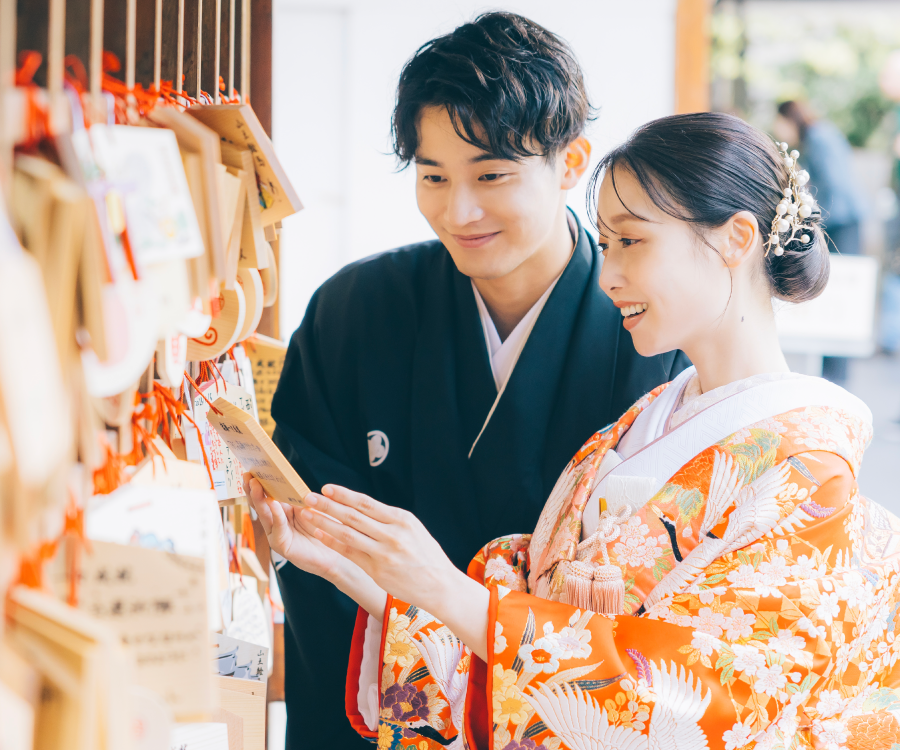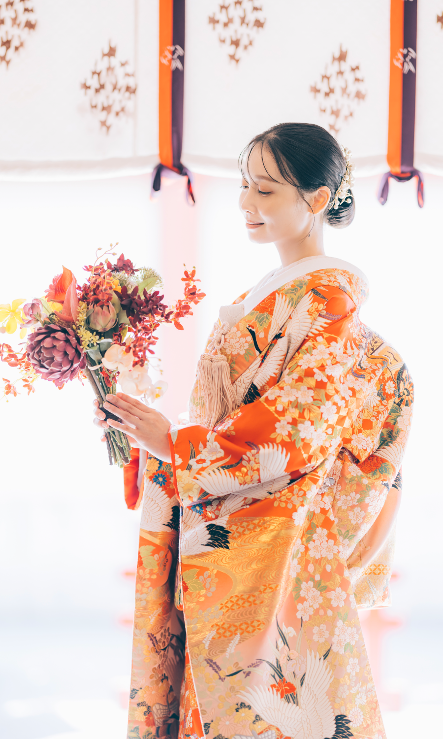 大切な人と一緒に写すウェディングフォトだから、お洒落には徹底的にこだわりたい。écrinなら日本庭園に映える色打掛や白無垢、ウェディングドレスを多数ストック。上質な衣裳コレクションから追加料金なしでお気に入りの1着を選べます。