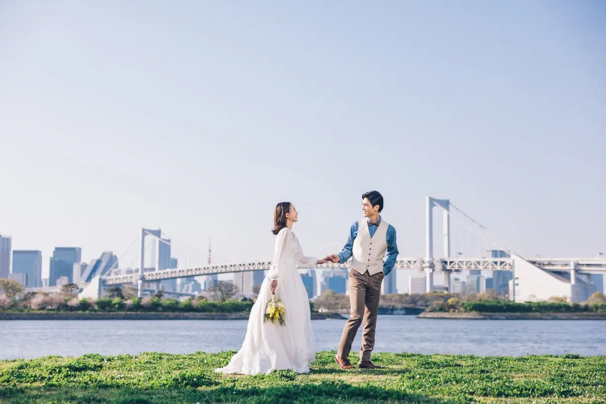 レインボーブリッジやフジテレビなどの東京都市と、海や緑の自然が融合する人気のロケーション。海に沈む夕日や夜の光輝く夜景はロマンティックなショットに。
