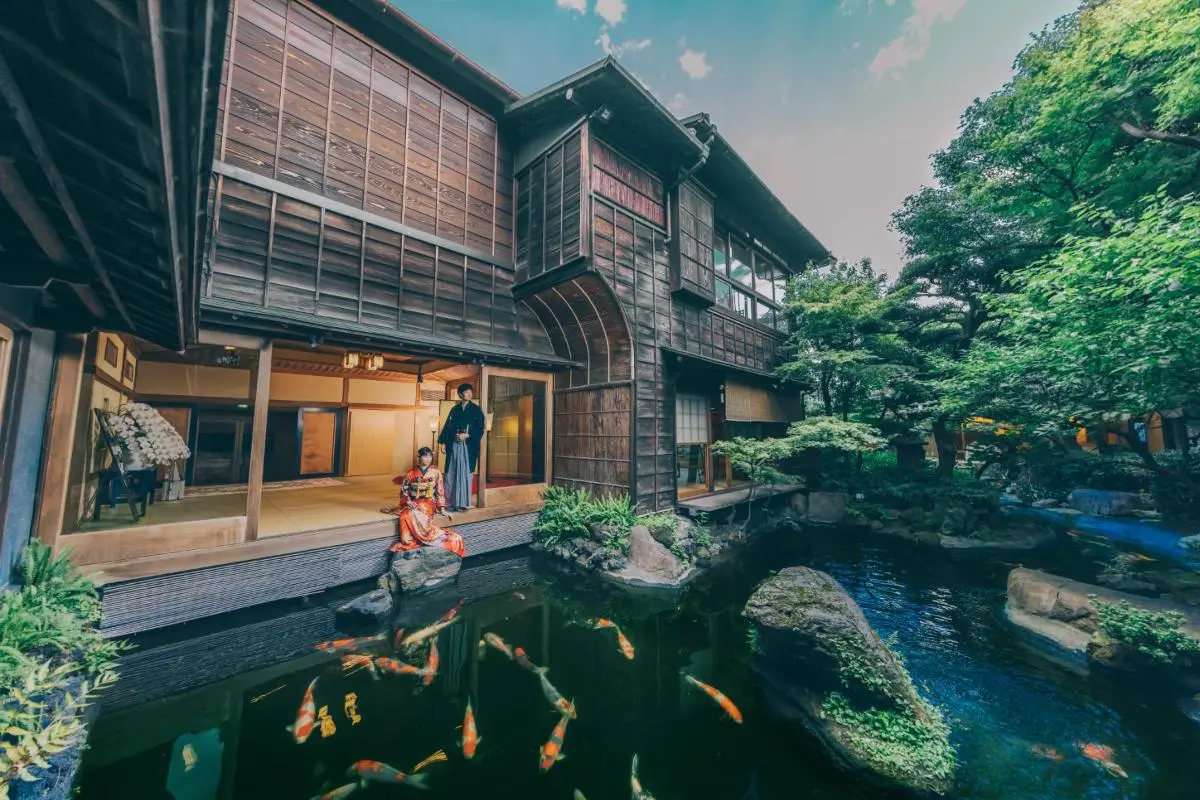 創業90年。隅田川沿いに800坪の敷地を誇る老舗料亭。春には玄関先や池に生けこまれた満開の桜での撮影、秋には真っ赤に染め上がった紅葉での撮影など四季折々の風景とともに移り変わる庭園を背景に写真を残せます。