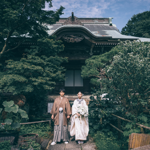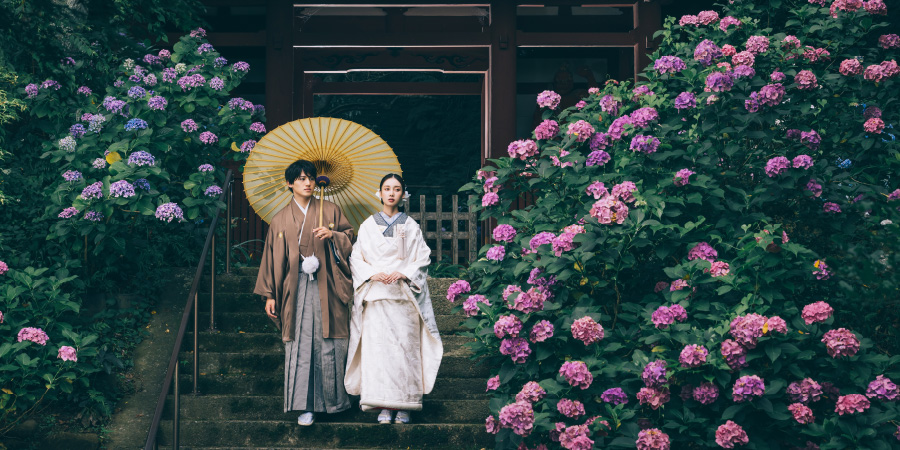 朱色が美しい仁王門と紫陽花をバックに撮る写真は、ノスタルジックな仕上がりに。緑あふれる美しい妙法寺で和装撮影はいかがですか。