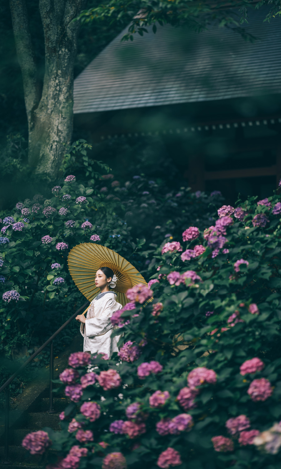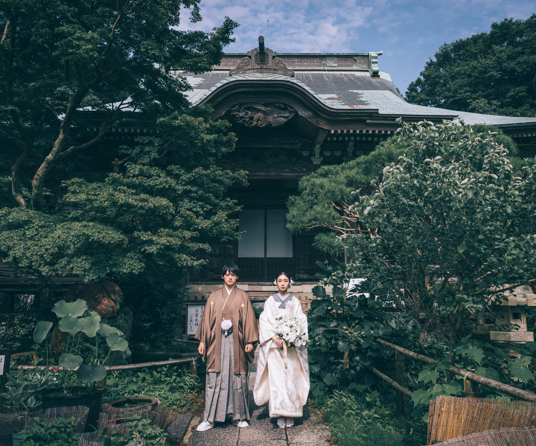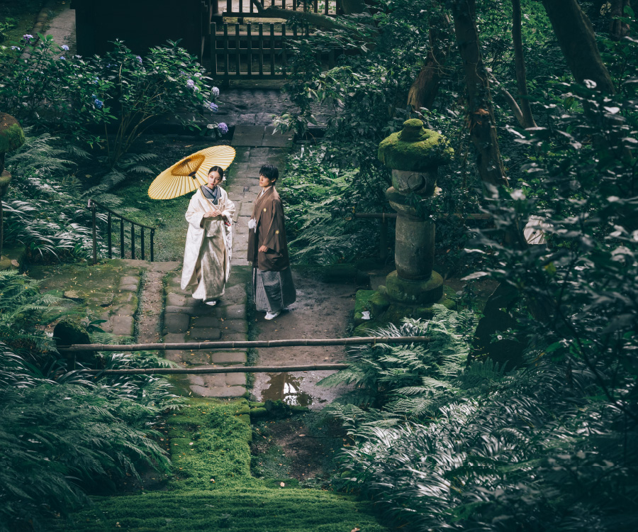 朱色が美しい仁王門と紫陽花をバックに撮る写真は、ノスタルジックな仕上がりに。緑あふれる美しい妙法寺で和装撮影はいかがですか。